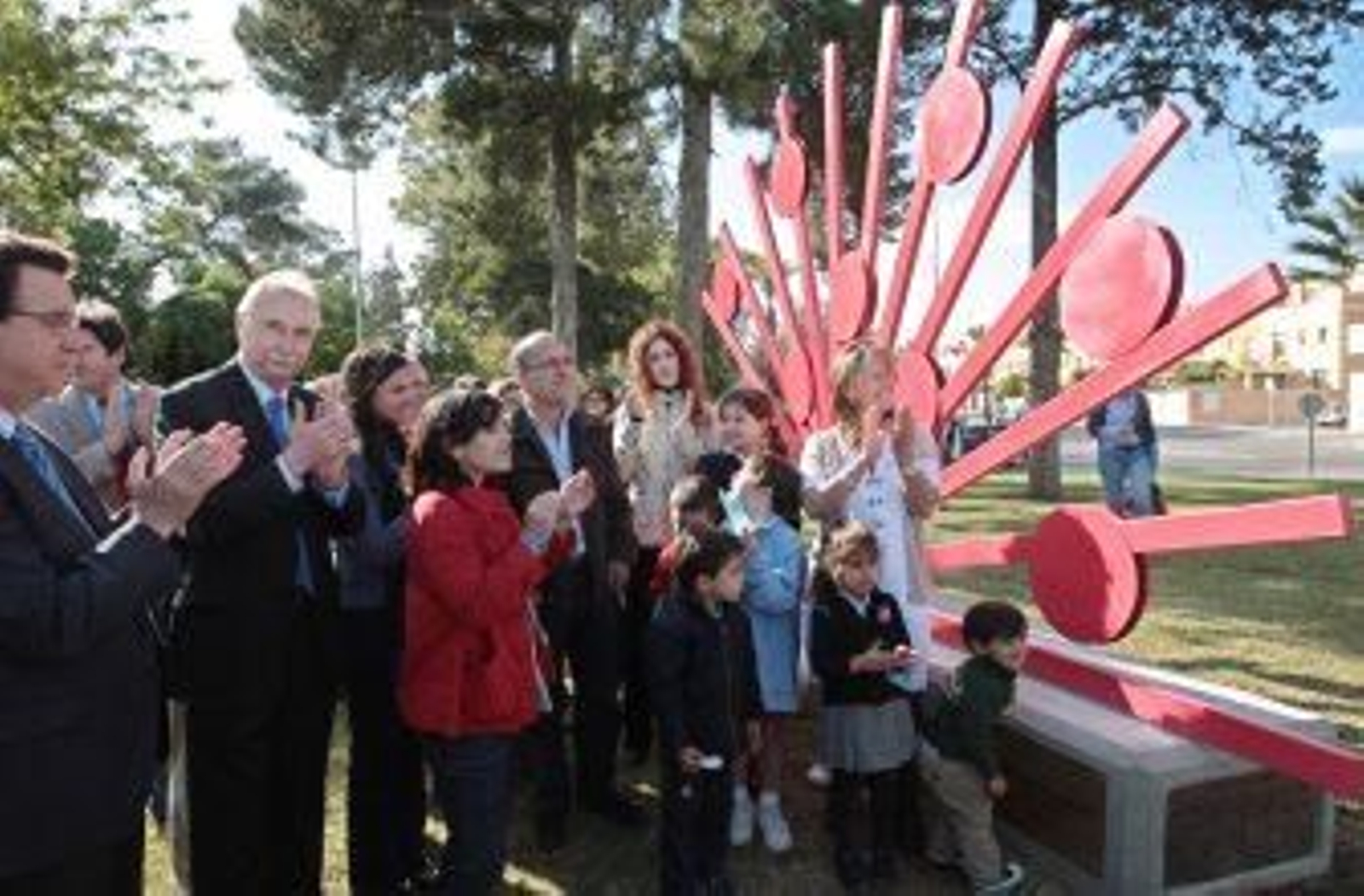 La glorieta de Jacaranda luce desde ayer un nuevo aire, el aire que le da el abanico diseñado por el artista jerezano Fernando Toro quien, con esta su primera escultura en un espacio público, quiere rendirle un homenaje a Andalucía: Sus ocho provincias son los ocho lunares que adorna este abanico rojo.