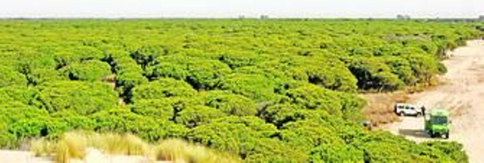 Conchas y 'corazas' de coquinas castañetean aplastadas por las ruedas del todoterreno. Se quedan incrustadas en la arena como porcelana rota. Son una veintena de kilómetros a lo largo de una playa eterna hasta llegar a la Torre Carbonero, que hacía antaño las labores de vigía, junto a otras similares en la costa. Hasta aquí llegan cuerdas vomitadas por el mar que Jaime recoge y lleva a su casa de Jerez, "porque para algo me servirán". Tierra adentro, el parque nos absorbe. Un extraño paisaje de arena y pinos conforman un laberinto. Por el camino se aparecen 'los santos', troncos de árboles muertos que fueron devorados por las dunas y de los que sólo quedan ahora estos esqueletos de formas fantasmagóricas. Parada en un cortafuego. Desde los lomos de una gigantesca duna se divisa el resto del mundo, parte de él. El visitante siente lo mismo que hubo de sentir Marco Rufo, aunque éste lo hizo desde el agua, cuando a lo lejos veía la figura de la mujer muerta de la Sierra de Grazalema, más tarde identificada por Schülten. Quizás, uno de los balcones más bonitos desde los que se habría asomado a lo largo de toda su vida. La duna abre sus fauces y engulle muy lentamente el mar de pinos, que intenta resistirse al ataque. Es cuestión de décadas, pero serán enterrados, además la falta de lluvia aligera el proceso.