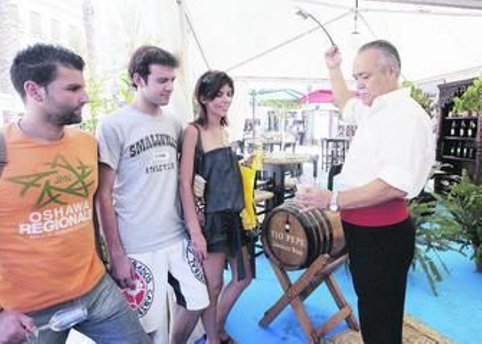 Son las 12.30 de un caluroso mediodía y los expositores que cada bodega tiene asignados ya están preparados para recibir a un público con ganas de degustar. "Lo primero que hago cuando llego es llenar las cubiteras de hielo y meter las botellas pues a nadie le gusta el vino a temperatura ambiente", asegura María Lara, responsable del expositor de Álvaro Domecq. Aún así, a medida que se van acercando las horas centrales del día, el Consejo Regulador del Vino dispone un camión de hielo en las inmediaciones del evento del que se benefician todas las bodegas colaboradoras. Son las 12.45 y la caseta que vende los tickets ya empieza a repartirlos. "Me parece una actividad estupenda y muy barata porque con la crisis que hay aquí te están dando una copa de vino y encima te puedes llevar el catavino a casa y todo por un par de euros", asegura una pareja que ha venido desde Francia a pasar unos días a Jerez. En una de las carpas más grandes de la muestra, la de González Byass, Paco Galdón empieza a llenar con su venencia las primeras copas de esta jornada. "El turista viene mucho porque la plaza del Arenal es un lugar de paso cuando vuelven de visitar las bodegas cercanas y concretamente les llama la atención este stand porque les damos la posibilidad de que si quieren pisar la uva lo pueden hacer". Aunque en este caso no han querido, Manuel Alejandro Soto y sus amigos se han acercado a este stand para hacer de anfitriones de Pedro Navarro, un amigo que desde Lleida se ha acercado a conocer Jerez y que con su catavino en la mano reconoce que "he probado el Solera pero no creo que me lo tome entero porque no estoy acostumbrado a beber". En otra mesa cercana, tres amigos acompañan la conversación con la tradición. "No perdono ni un día mi copita de 'Tío Pepe', así que he comprado mi catavino. Aunque creo que la consumición te la deberían regalar", asegura Enrique Montes, un jerezano. Son las 13.00 del mediodía y el número de visitantes va en aumento. Concretamente en el stand de Romate se encuentran sentados dos amigos que depositan sus copas en unas bajitas mesas sevillanas. "He venido expresamente desde Trebujena para probar una copita de Fino Marismeño, que no lo tomaba desde la feria", reconoce Bartolomé Varela. Debe ser que en la innovación está el gusto pues una de las bebidas que más se reparte en el stand de Sandeman es su exclusivo 'Spritzz', una mezcla que aunque se parece al conocido 'rebujito', en este caso es un poco más dulce por estar hecha con un 'Dry Don', hielo y Sprite. Pilar Muñoz, Directora del Centro de Visitas de esta bodega, opina que "lo único que faltaría sería más información sobre cómo funciona 'De Copa en Copa', pues muchos turistas vienen sin saber que hay que comprar el catavino". Recipiente que no falta en las manos de un grupo de jerezanos que ante el stand del Grupo Garvey reconocen que "seguiremos viniendo hasta el sábado que se acabe.