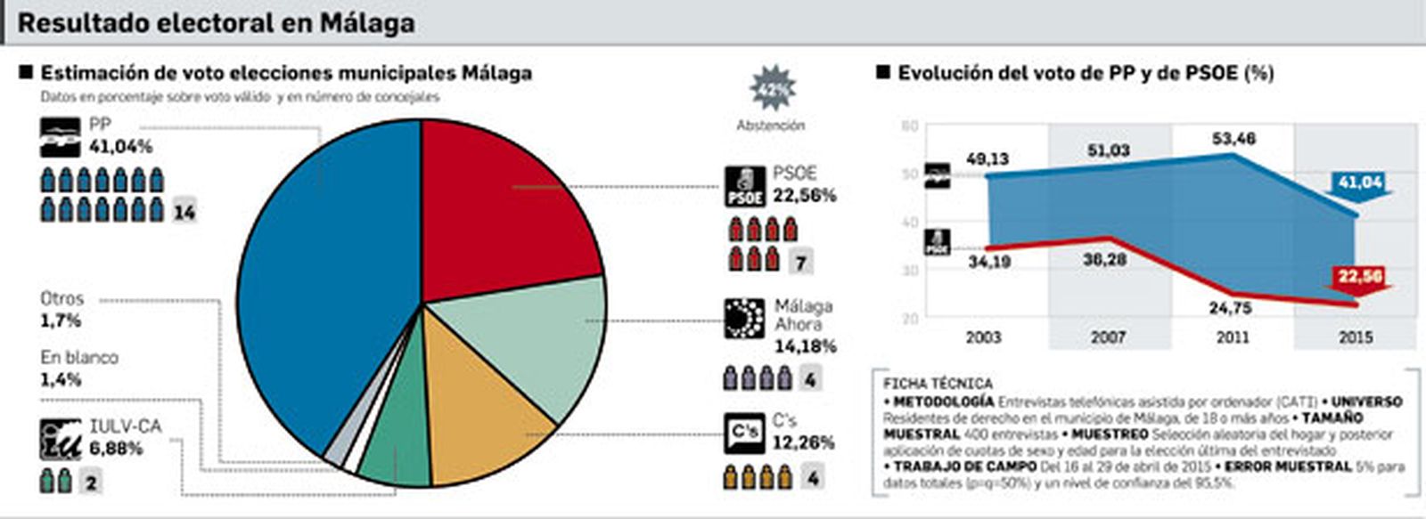 La Corporación que surgirá del próximo 24 de mayo, en el supuesto de materializarse estas previsiones de voto, será la más variada de la historia del Ayuntamiento de la ciudad, con cinco formaciones políticas con representación. A los 14 representantes populares se sumarían 7 del PSOE (dos menos que en la actualidad), 4 de Málaga Ahora, 4 de Ciudadanos y 2 de Izquierda Unida Málaga para la Gente.