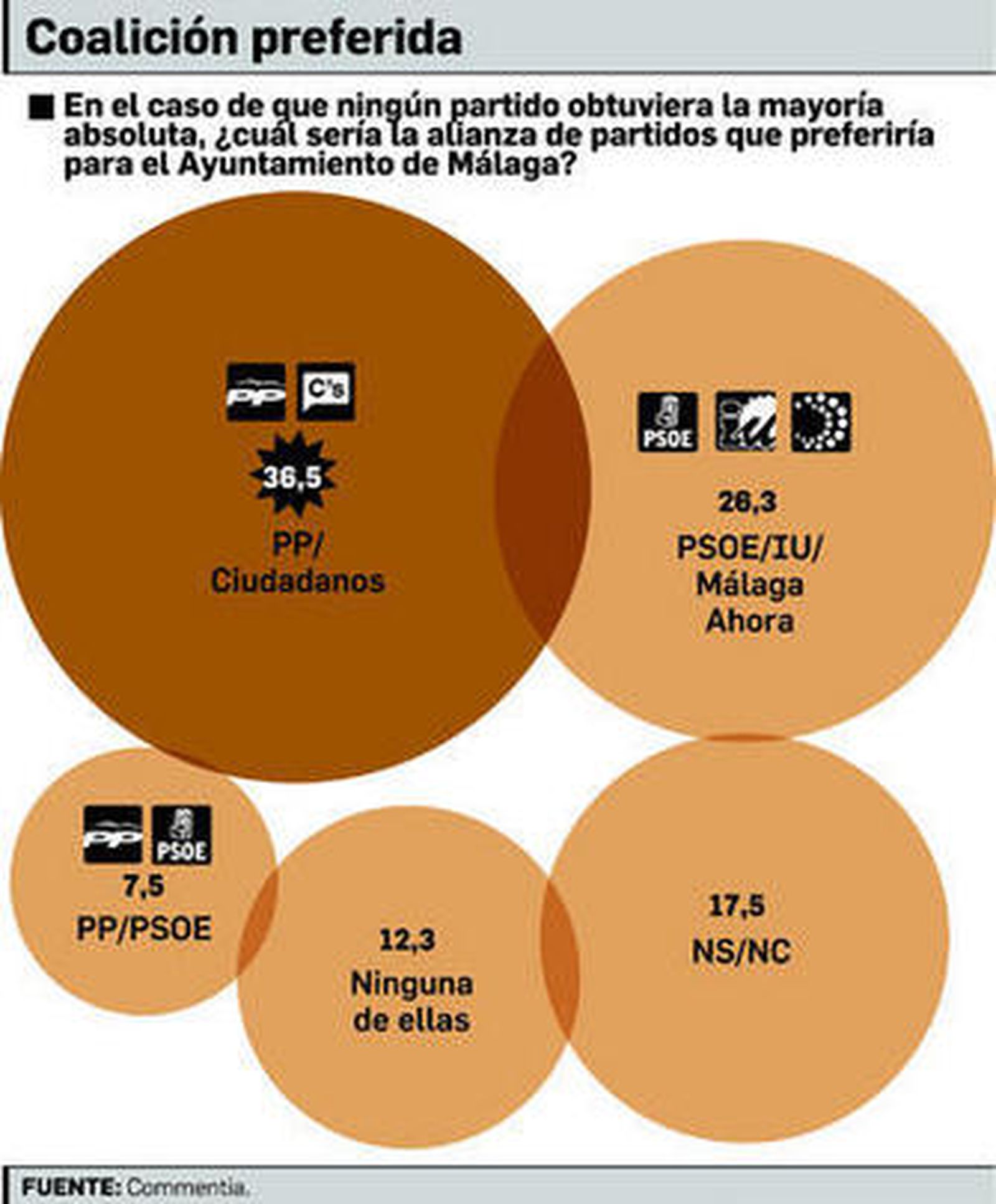 La segunda de las alternativas de pacto que mejor nota recibe es la integrada por el PSOE, IU Málaga por la Gente y Málaga Ahora, con el 26,3%. Es apreciable el valor que a esta hipotética alianza progresista dan los que cuatro años atrás votaron a IU, al punto de apoyarla un 76,7%, dato sensiblemente superior, por ejemplo, al de los votantes del PSOE, de los que sólo el 50,6% dice estar a favor. Los votantes malagueños no contemplan como factible o deseable un hipotético pacto entre el PP y el PSOE, ya que sólo defiende tal solución un 7,5% de los encuestados, siendo más amplio el predicamento entre los socialistas (14,8%) que entre los populares (8,2%). En materia de alianzas entre partidos existe un 12,3% que no ve con buenos ojos ninguna de las planteadas y otro 17,5% que directamente no sabe o no contesta. Entre estos últimos, un 34,1% no votó en la cita de 2011, un 18,2% que votó a otros partidos o lo hizo en blanco y un 13,5% que se decantaron por el PP.