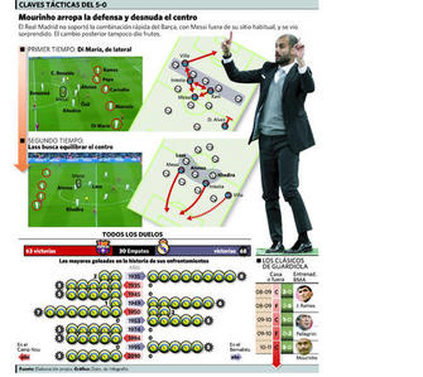 Mourinho mandó a su gente a defender con cinco hombres. Y previendo que por la derecha le iba a entrar una vía de agua con Daniel Alves y Messi, mandó a Di María a ayudar a Marcelo, pero éstos, con el lateral culé con el freno de mano echado y el argentino haciendo ronditos en el centro, se encontraron que no tenían a nadie a quien marcar y corrían como pollos sin cabeza a ningún sitio. Mientras, el Barça tenía superioridad numérica (justo lo que buscaba) en el triángulo Messi-Iniesta-Xavi, que aprovechaban el galimatías que tenían Marcelo y Di María para romper el fuera de juego. Lo extraño fue que Mourinho nunca había defendido así en el Camp Nou. Se recordaba que con el Inter, y con diez, mantuvo a Milito y a Eto'o en el campo haciendo de éste un espectacular lateral izquierdo. Lo quiso repetir, pero, claro, Di María no es Eto'o.