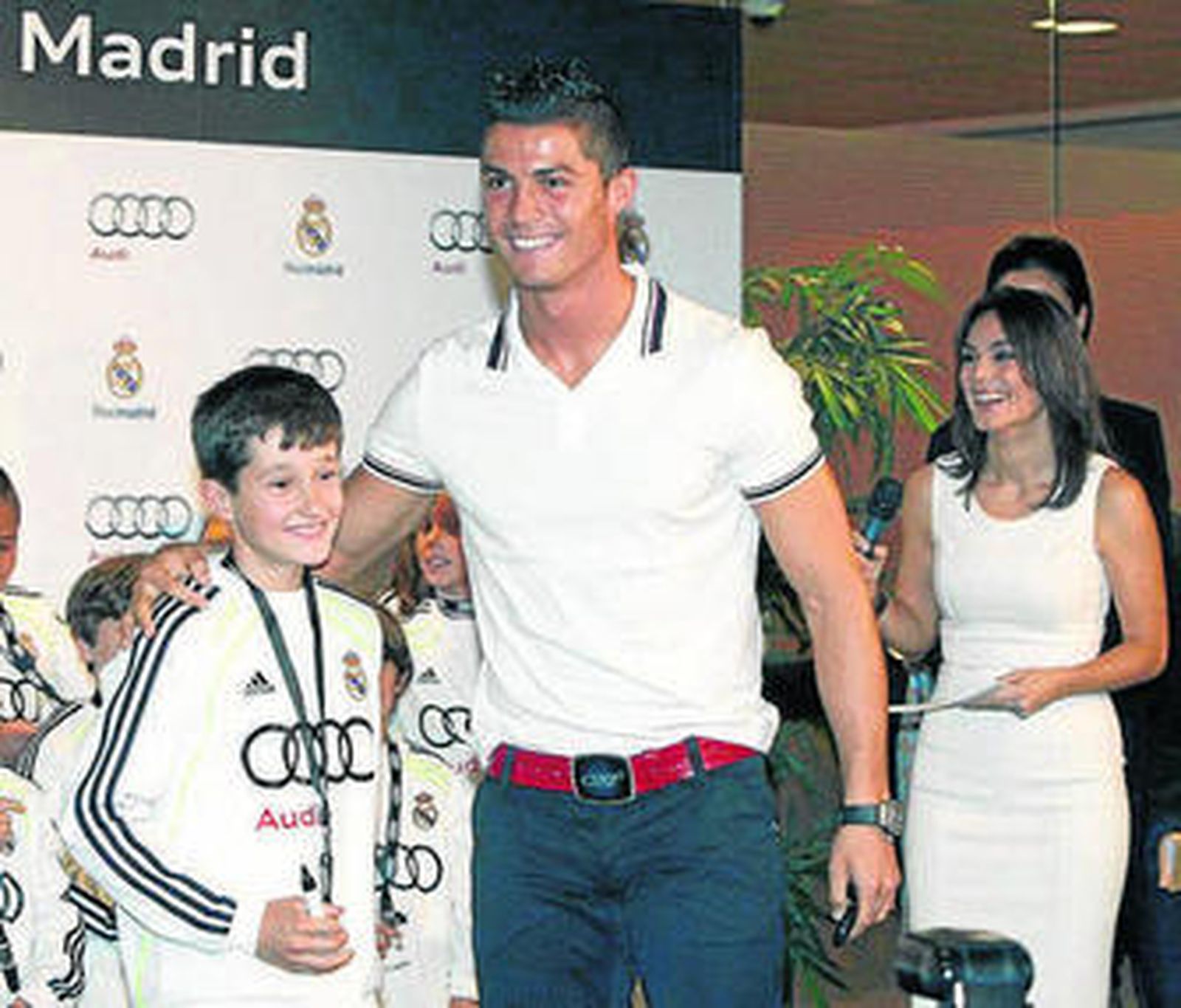 El técnico del Real Madrid José Mourinho fue uno más entre sus jugadores, en el acto de entrega de los nuevos coches Audi en el estadio Santiago Bernabéu, en en el que también estuvieron presentes Florentino Pérez y Zinedine Zidane.