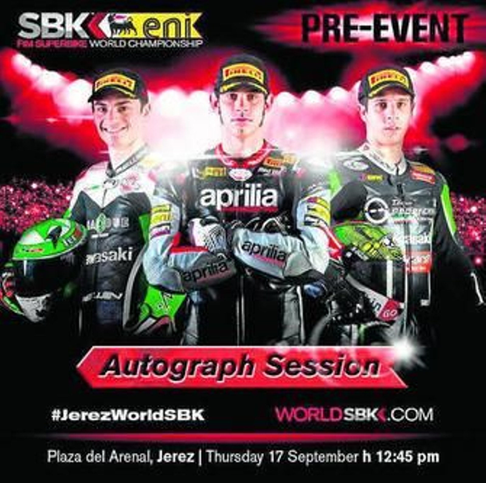En efecto, para el Pirelli Spanish Round de Superbike que se disputará este próximo fin de semana, se ha preparado un evento previo en Jerez en la jornada del jueves con algunos de los principales protagonistas; este evento consistirá en una visita al Alcázar de Jerez -con sesión de fotos de los pilotos- seguido de una firma de autógrafos para el público en la Plaza del Arenal.