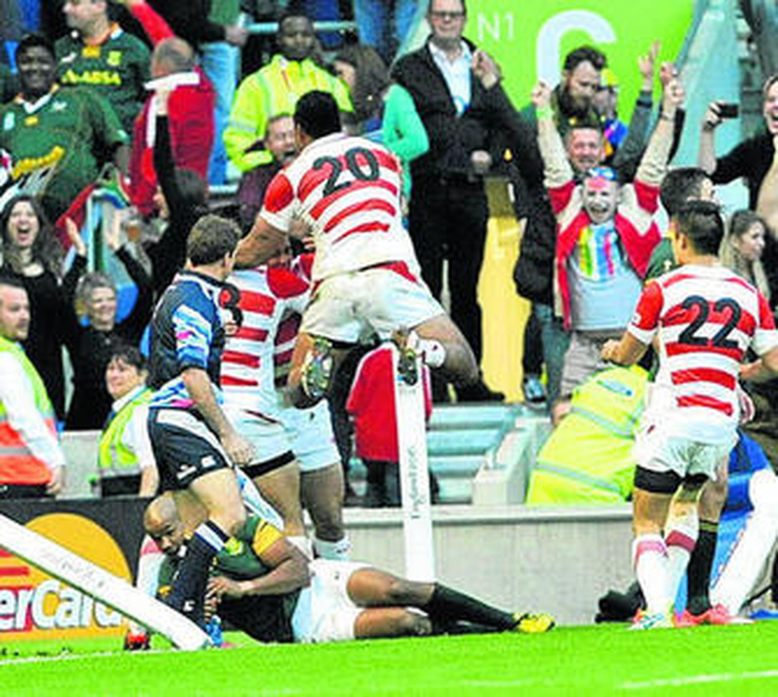 La selección japonesa logró uno de los mayores impactos de la historia del rugby al vencer por 34-32 a Sudáfrica en el debut de ambos equipos en el grupo B del Mundial de Inglaterra. Un ensayo de Karne Hesketh en la última jugada del partido le dio la victoria a los japoneses, que hasta esta sorpresa sólo habían ganado un partido en sus siete participaciones mundialistas, con dos empates y 21 derrotas.
