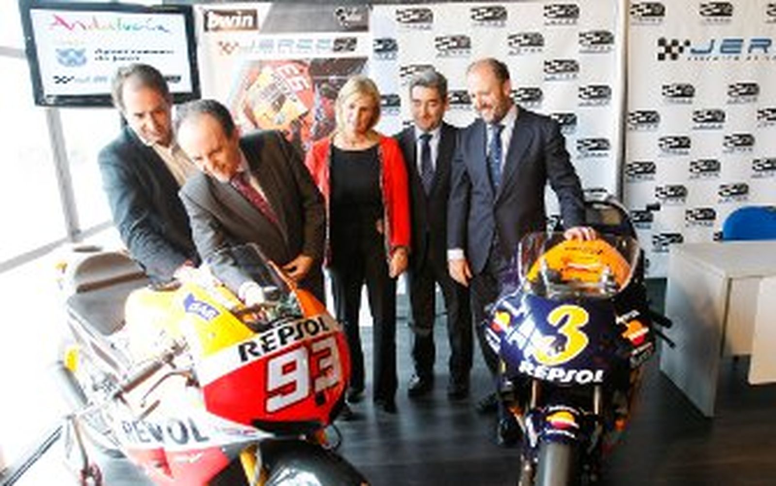 María José García-Pelayo, alcaldesa de Jerez, acompañada por Rafael Rodríguez, consejero de Turismo y Comercio de la Junta de Andalucía, y Enrique Aldama, director de Dorna Sports, presentó ayer la XXVII edición del Gran Premio de España de Motociclismo, que se celebrará en el Circuito de Jerez del 2 al 4 de mayo.