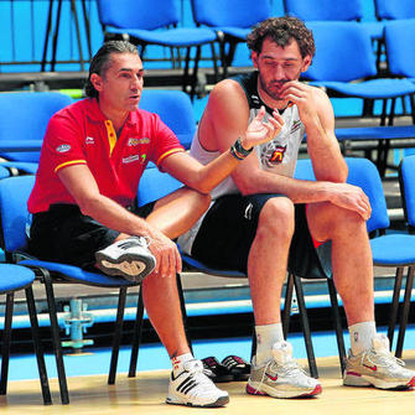 Rudy Fernández, que sufrió molestias en una pierna, siguió el entrenamiento desde una silla y Marc Gasol no acudió a ella, ya que se le realizaron pruebas médicas en un centro de la capital riojana para determinar la importancia de una contractura en la espalda por la que se retiró del encuentro ante Argentina.