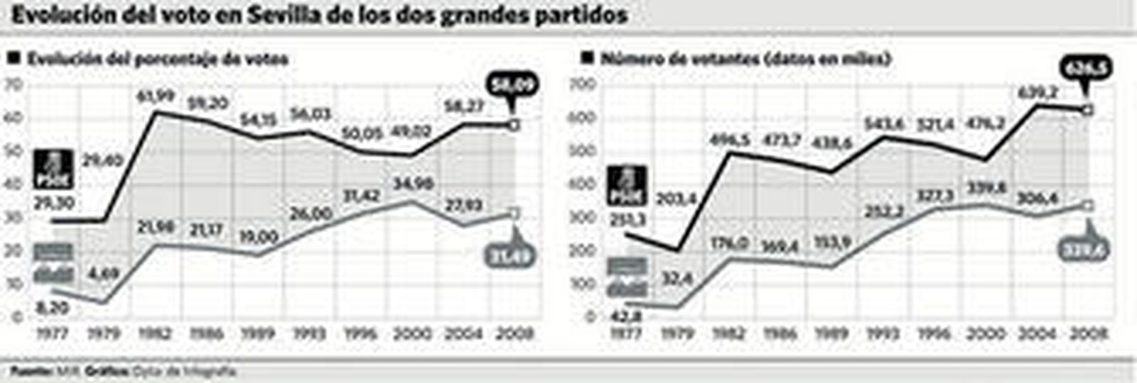 El PSOE siempre ha ganado en Sevilla unas elecciones generales, autonómicas y europeas. Sus únicos tropiezos han sido en las municipales, pero incluso en dos derrotas (1999 y 2007) logró formar gobierno en el Ayuntamiento con los apoyos del PA e IU, respectivamente. Nunca se ha discutido que la marca electoral del puño y la rosa arrasa en la circunscripción de Sevilla, "la tierra de Felipe González" como la definió Zapatero en un mitin en mayo en el barrio de Pino Montano con asientos libres. Los socialistas han contado con ocho diputados por Sevilla en la Carrera de San Jerónimo frente a cuatro del PP en esta última legislatura. De 1982 a 2008 han sacado siempre ocho salvo en 1996 y 2000 -ya en el período del posfelipismo- en que perdieron uno y bajaron a siete. Pero la diferencia entre ambos grandes partidos ha resultado siempre insalvable para el centro-derecha en una circunscripción y en una región que ha lastrado en muchas ocasiones los objetivos trazados por el PP en su sede central de la calle Génova.