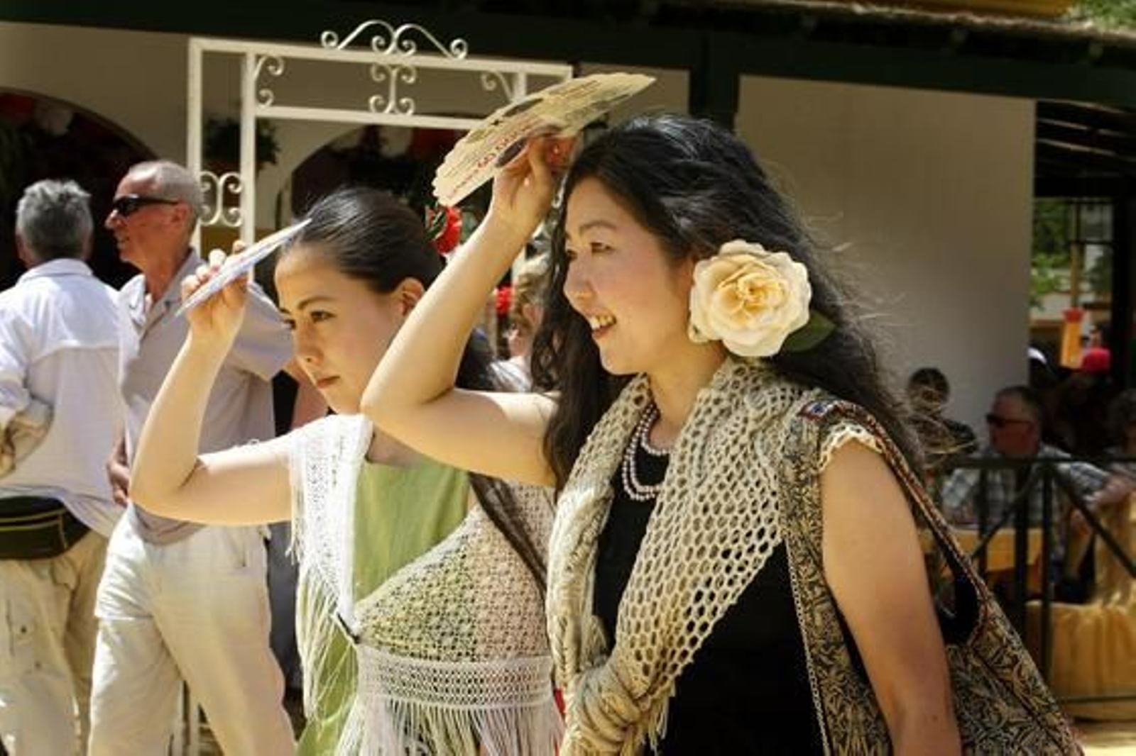 Así que entre frases como "los romeritos no me lo desprecies" y "tengo un salpicón de marisco que quita el sentío", me di cuenta que si bien las gafas de sol y los mantoncillos eran los complementos fetiches de la jornada, tampoco faltaron los abanicos de todos los colores y formas, y hasta los paraguas para resguardarse del sol. La gente iba buscando por el real hasta la sombra de los pinos de María del Monte y era habitual ver a los guiris con un tono de piel más cercano al rojo pasión que al blanco roto.