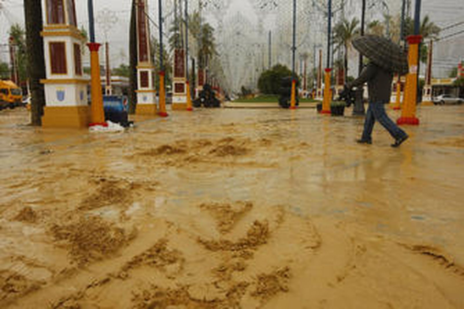 El aguacero caído ayer y el paso de vehículos ha dejado muy tocado el albero del Real de la Feria, en especial en los paseos centrales aunque también hay casetas cuyos accesos han quedado bastante deteriorados. El toro del agua ha pillado precisamente a aquellos caseteros que menos avanzado tenían el montaje. Además, la lluvia provocó la interrupción del suministro eléctrico en algunas ocasiones, apuntó ayer uno de los miembros del Club Cherokee, que apuraba el montaje de su entoldado.