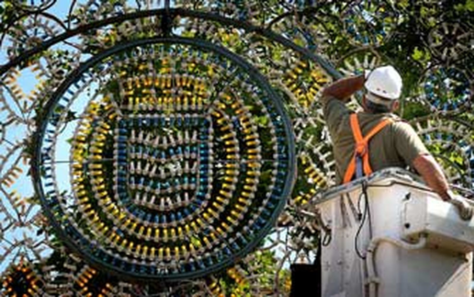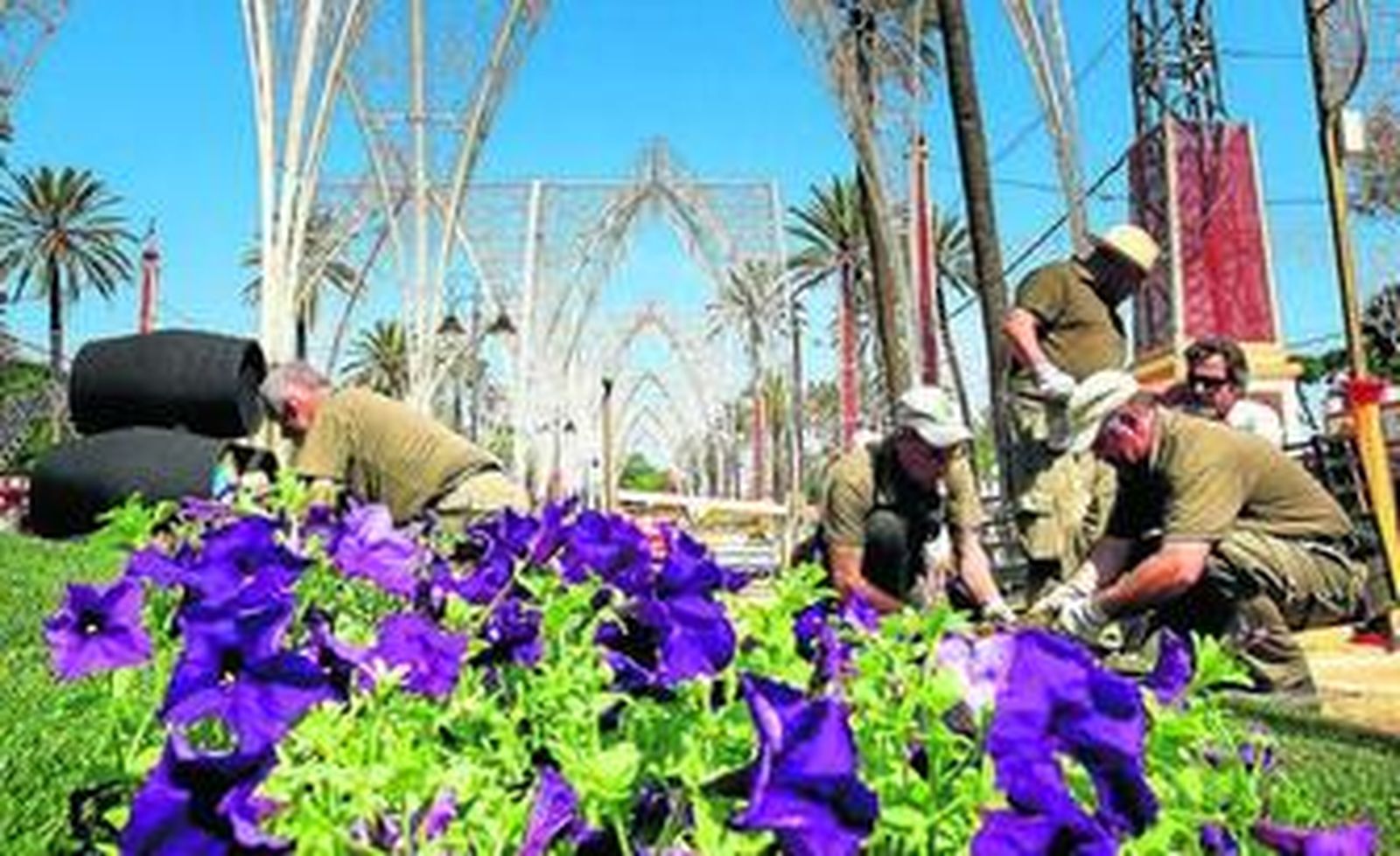 En la glorieta central de la Feria, jardineros municipales ponen los últimos tepes de césped, a los que se unen petunias de color morado y gazanias, mientras que arriba, subidos en grúas, operarios de Iluminación Ximénez dan los últimos retoques al espectacular nuevo alumbrado del Paseo de Las Palmeras. Manuel Tenllado, supervisor de la empresa, indica que se han instalado exactamente 34 pórticos bóvedas divididos en dos paneles de 17x2 metros. "Es la primera vez que se instala en una Feria, aunque en Valencia, para las Fallas, ya se pusieron dos. Es algo absolutamente majestuoso y lo más novedoso en cuanto a alumbrado", afirma orgulloso. Desde luego, las bóvedas han supuesto un gran trabajo de ingeniería. Ahora bien, ¿gustará al jerezano, más acostumbrado al tradicional alumbrado? "Estoy convencido de ello", señala. "Sólo hay que ver la altura que tienen y el espectacular efecto que crean". En cuanto a sí en años venideros se ampliará este tipo de alumbrado a otras calles, Tenllado lo descarta ya que "hay que diferenciar la principal del resto, así ocurre en todas las ferias".