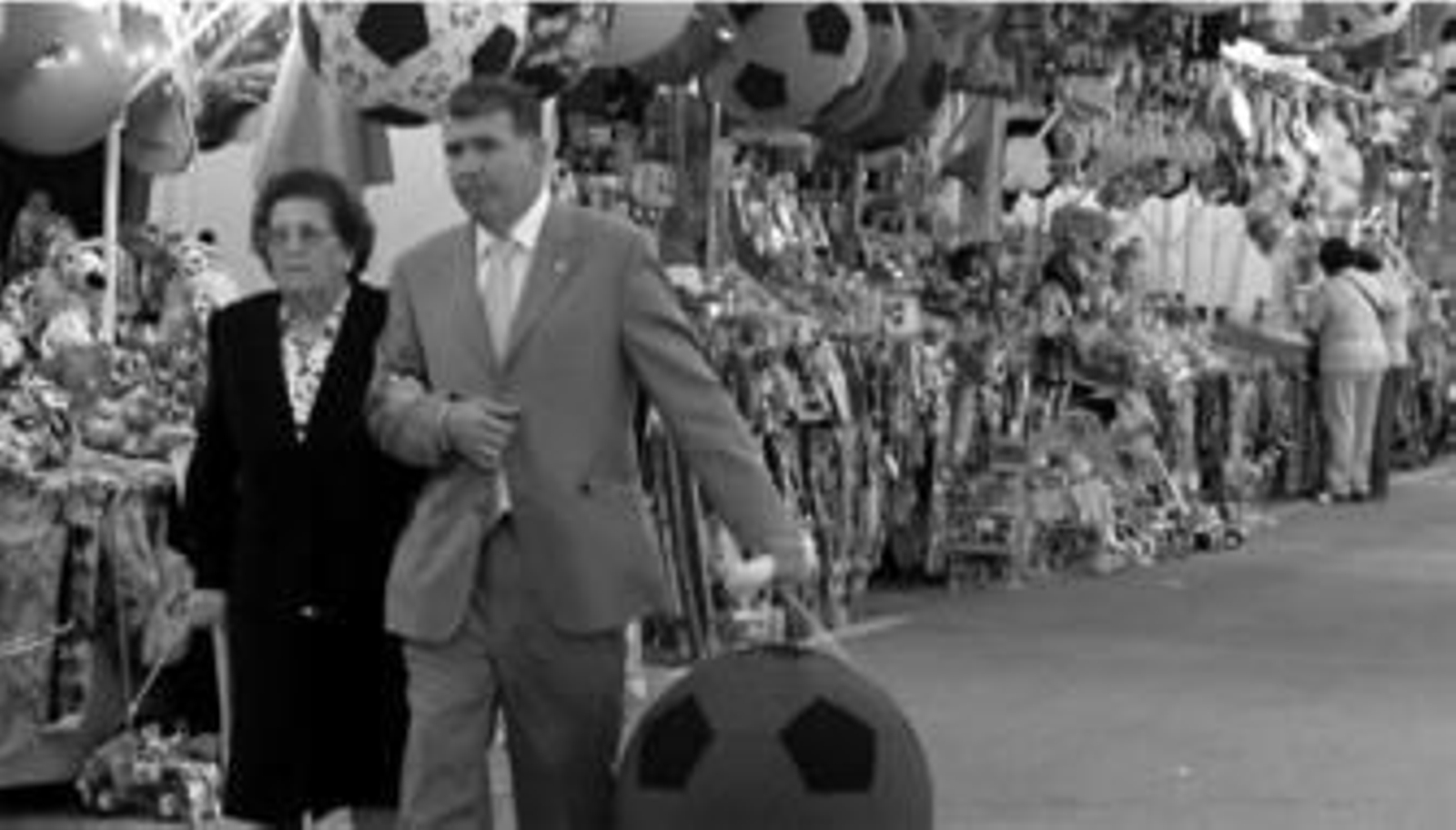 Gonzalo tiene poco más de un año y es la primera vez que visita, junto a sus padres, la Feria del Caballo. Apenas es capaz de comprender qué significan tantas luces y tanto ruido pero levanta las manos emocionado cada vez que algo llama su atención. En la zona de las atracciones, en brazos de su padre, mira como coches, aviones y motos de pequeño tamaño dan vueltas envueltas en una nube de polvo y luces. Sin embargo, no es hasta llegar a las tómbolas cuando grita emocionado ante tantos objetos. Aún no sabe hablar, pero patalea y mueve los brazos intentando alcanzar un balón de grandes dimensiones que cuelga de la mayoría de toldos de las tómbolas. El balón, que imita a los de fútbol aunque de mayor tamaño, parece haberse convertido en la 'estrella' de estos puestos ambulantes, no sólo para Gonzalo sino también entre otros muchos visitantes que se ven pasear por el Real con este 'trofeo' entre las manos. Ni siquiera los peluches y los muñecos que imitan a los de las series de televisión pueden quitarle este año el protagonismo a la pelota en cuestión. De hecho, ya parecen haber pasado de moda aquellas mini-motos que en anteriores ediciones colgaban de los puestos ante la mirada emocionada de aquellos que se acercaban.