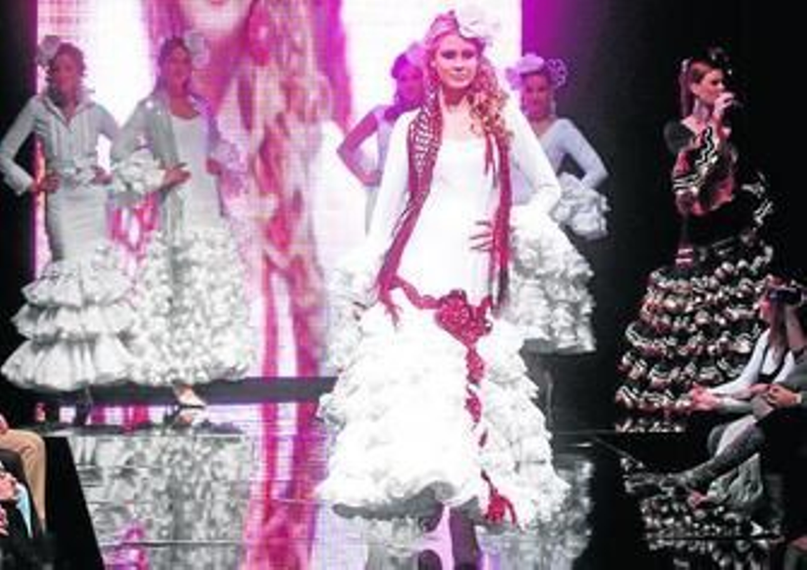 La primera de la tarde, una de las grandes: la portuense Ángeles Verano con su colección 'Color de Abril'. Siempre curioso a las antologías de la creativa diseñadora, esta vez sorprendió al público por alejarse de lo moderno en pos de una búsqueda real de la auténtica raíz del vestido de flamenca. Este nuevo concepto capaz de inspirarla en su última colección lo describía así, "he querido recrearme en un ambiente donde los colores y la alegría transporten al público al real de la feria". Y no es para menos, fueron 'Los Marismeños' los encargados de traernos a la mente ese albero de las casetas, al ritmo de sus sevillanas. Minuciosa hasta la saciedad, Verano impuso ayer los vestidos largos y los de media pierna, llamativos volantes que llegaban a empinarse descarándose a la gravedad, una vuelta al lunar en todas sus vertientes y sobre todo mucho fleco. Las flores altas y naturales acompañaron a unos complementos que jugaron un gran protagonismo en el maridaje telas - abalorios.