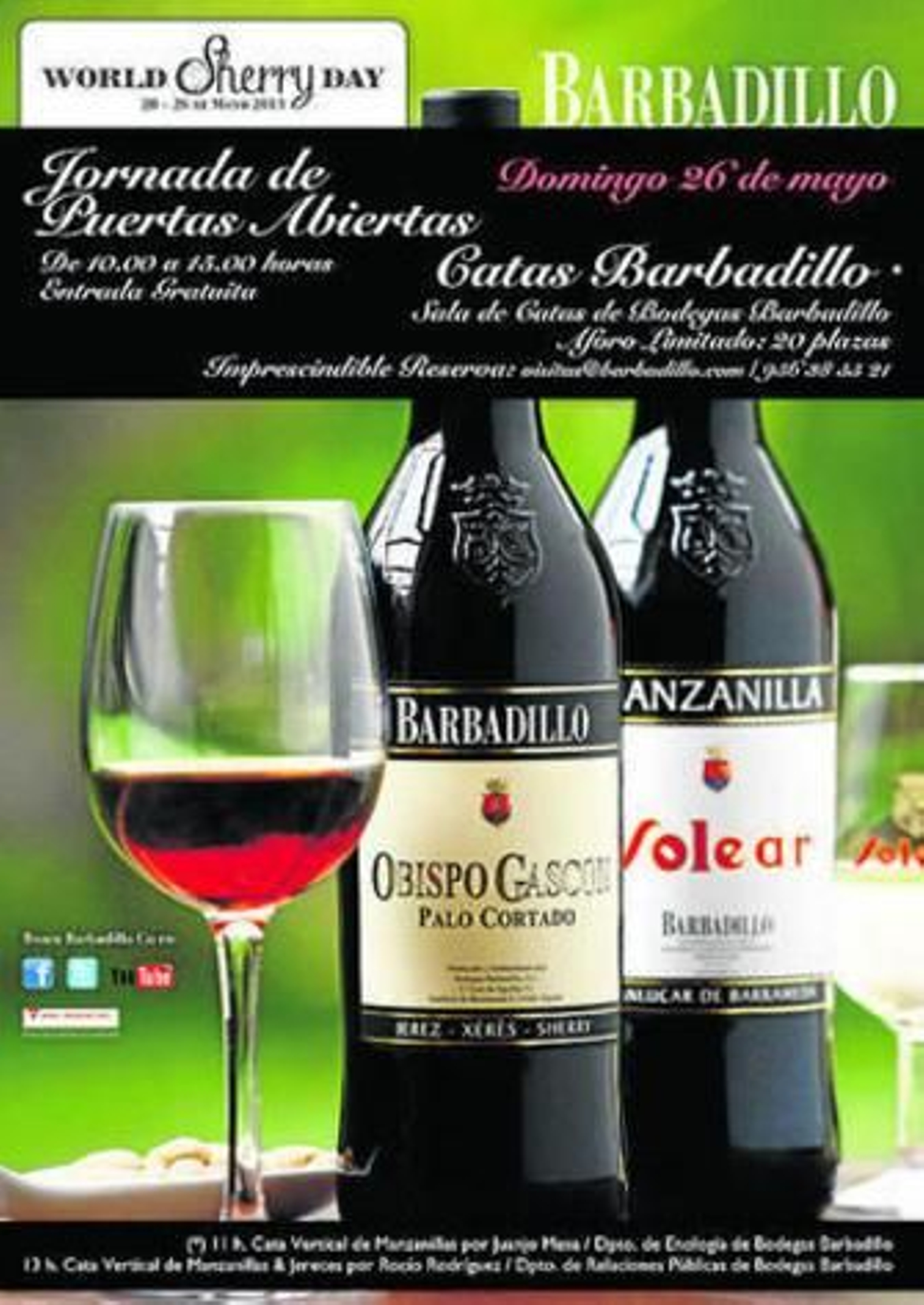 Entre las muchas bodegas sanluqueñas que se han sumado en estos días a la celebración del 'World Sherry Day', Barbadillo dio a conocer ayer su amplia programación de actividades que se desarrollarán el próximo domingo en sus instalaciones bodegueras. Junto a la jornada de puertas abiertas para las visitas de diez de la mañana a tres de la tarde, la firma sanluqueña ha organizado un completo programa de catas que comenzará a las once de la mañana y se extenderá hasta la una de la tarde.