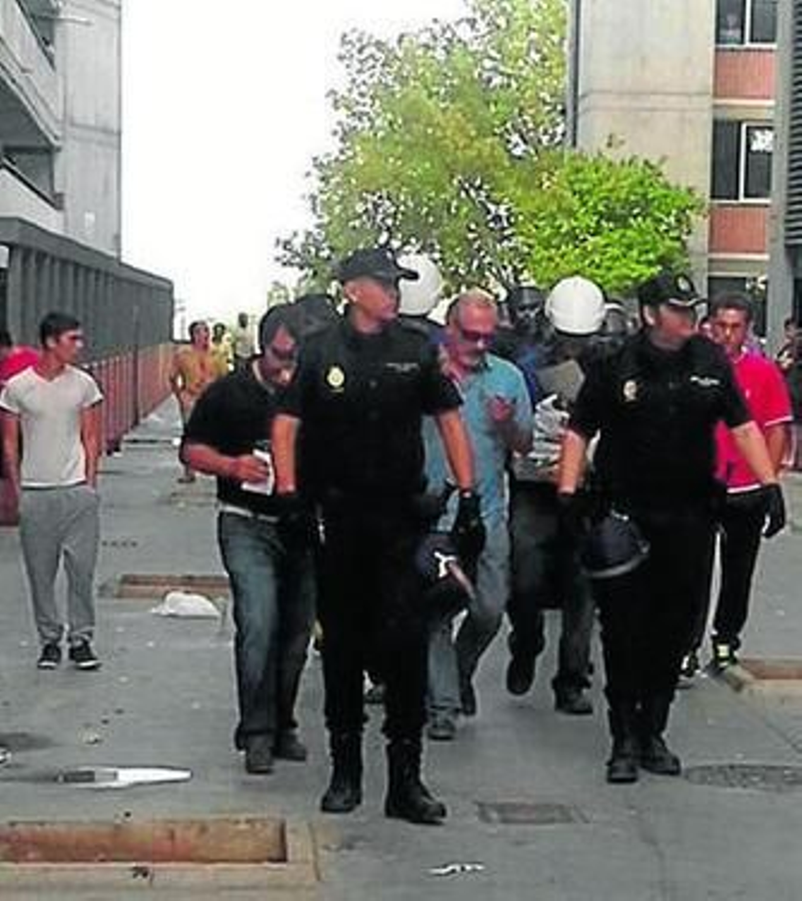 Agentes antidisturbios del Cuerpo Nacional de Policía escoltan a los operarios de la eléctrica que suprimieron las conexiones, algunas de ellas de hasta 10 años de antigüedad