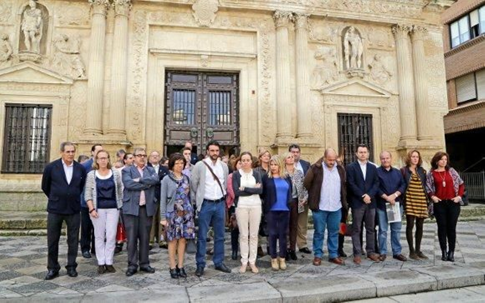 La alcaldesa, Mamen Sánchez, junto a miembros de la Corporación secundaron ayer el minuto de silencio convocado por el Gobierno de la Nación, en la puerta del Cabildo Antiguo, en repulsa por los atentados del pasado viernes en París y en solidaridad con los familiares de las víctimas y el pueblo francés.