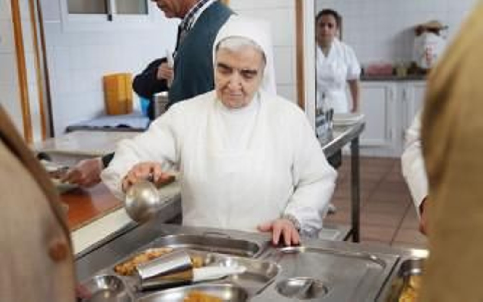 El día a día de las Hijas en la comunidad de El Salvador comienza a las seis y media de la mañana, cuando se disponen para la oración y el desayuno. Todas menos la encargada de la cocina, que irá a una misa más tarde porque desde primera hora se ubica entre fogones. A las doce está todo dispuesto. Le echan una mano dos cocineras y tres o cuatro voluntarios, según dispongan los turnos semanales. "Me gustaría que dijeras que en Jerez nos quieren mucho y que en cuanto hemos abierto la boca para pedir algo, comida o lo que sea, la gente se ha volcado. Esta Navidad ha venido mucha gente entregándonos de todo", agradece sor Victoria. Algunos de los que contribuyen al sostenimiento del comedor "es gente que en su día pasó mucha 'jambre' y que ahora lo agradece así", dice la hermana, subrayando una pronunciadísima aspiración de la hache que suena a jota. A la una y media el comedor queda vacío y los voluntarios ya tienen todo recogido.