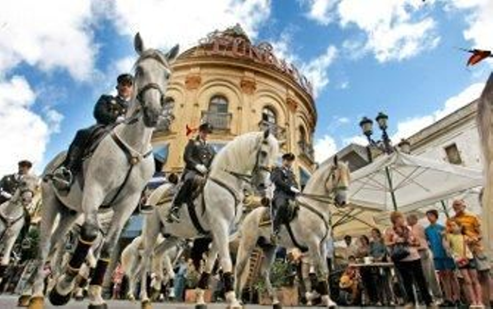 Y qué mejor forma de conjugar la historia de una ciudad con uno de sus símbolos principales, como es el caballo. Una treintena de sementales recorrió desde las once y media de la mañana el camino que separa a la plaza del Mamelón de la Alameda Vieja. Dentro del complejo monumental del Alcázar, en el Patio de Armas, representaciones de todo el tejido asociativo y cultural de la ciudad asistieron a la izada de la reproducción del Pendón en la Torre del Homenaje, tras unas palabras del comisario del 750 aniversario de la adhesión de Jerez a la Corona de Castilla, Manuel Antonio García Paz. Junto a él, casi en formación, se dispusieron representantes de todos los cuerpos de seguridad, como el Ejército de Tierra, Guardia Civil, Policía Local y Nacional y el Consorcio de Bomberos.