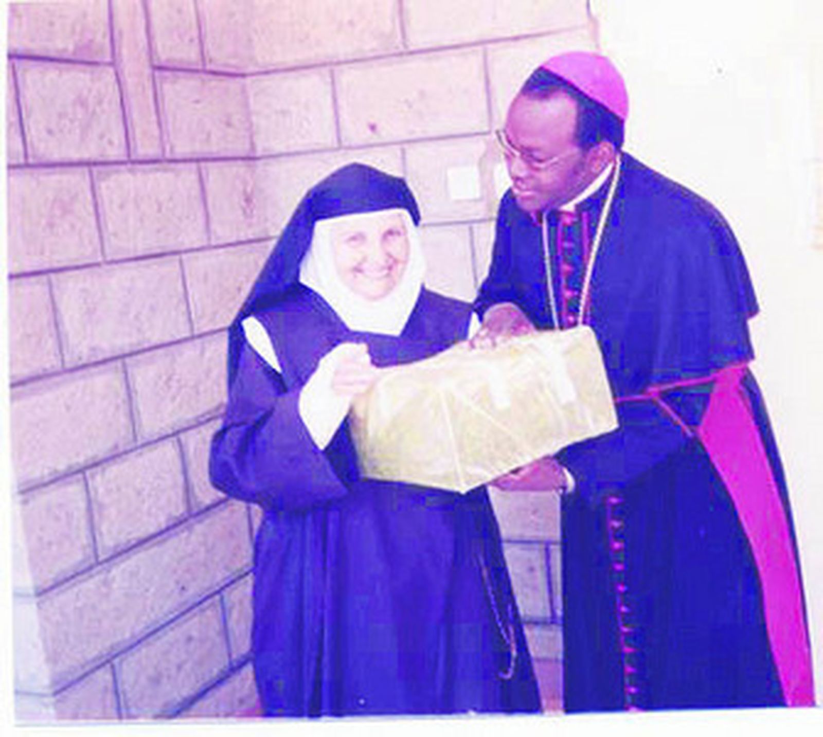 1.- Sor Magdalena - primera por la izquierda - retratada en la misión, bajo la bandera de España, junto a otras religiosas de su orden en Kenya. 2.- La madre Magdalena Medrano, recibiendo una tarta, el día de su santo, de manos del obispo de Nairobi, monseñor Martin Kivuva.