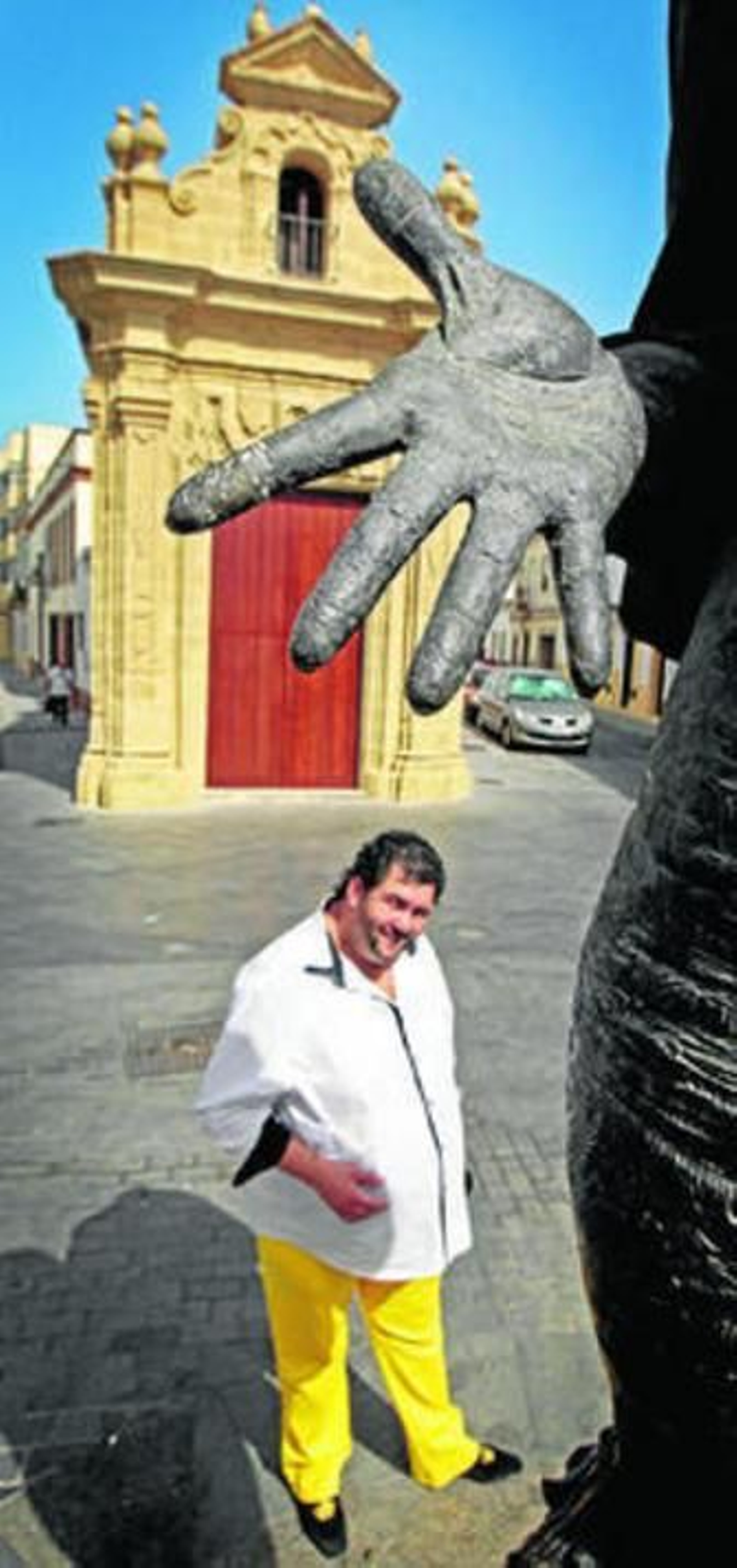 Juanillorro posa junto a la estatua de La Paquera y su ermita de La Yedra.