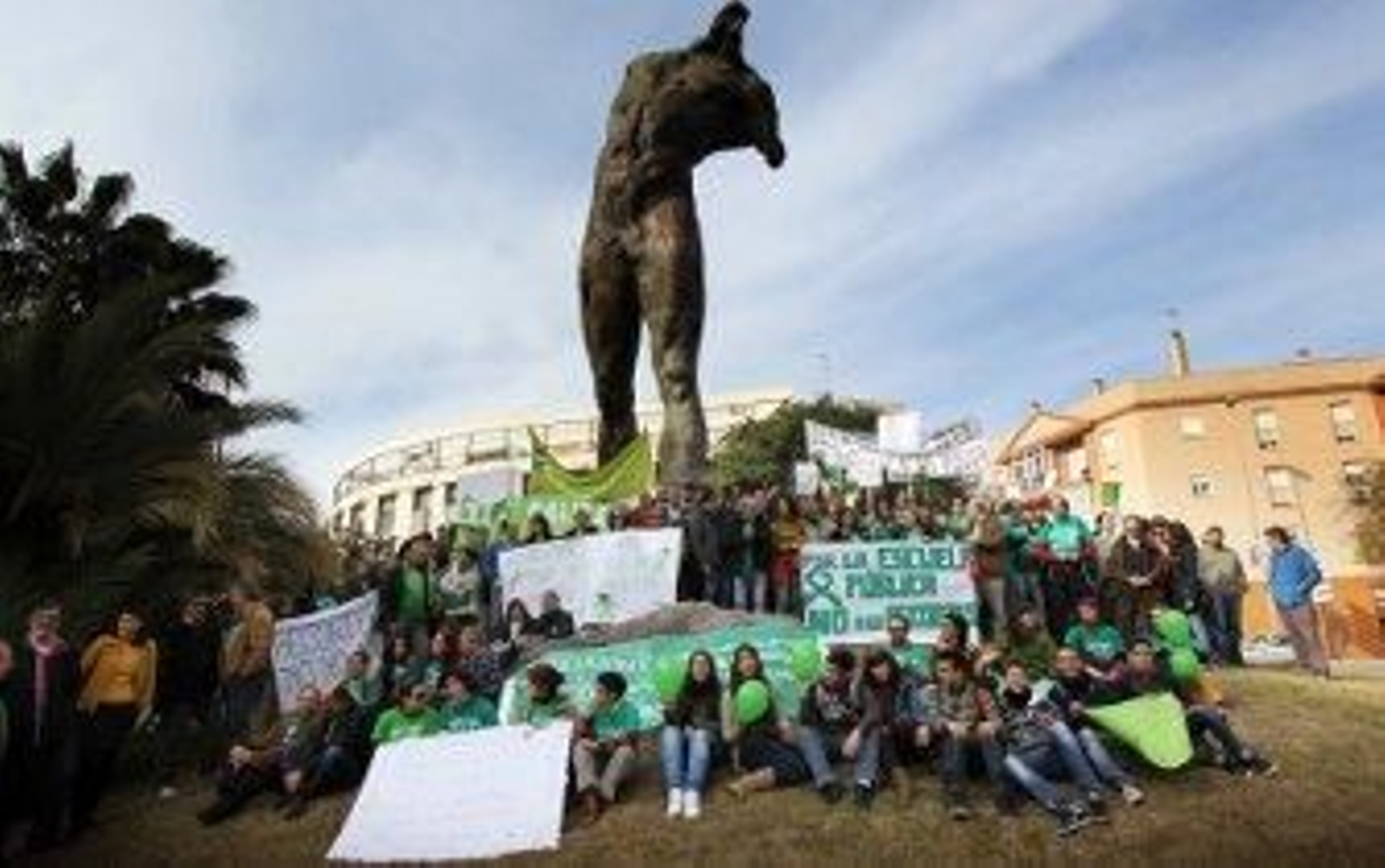 “Todo el sistema educativo se está descalichando, poco a poco, pero se está viniendo abajo”. Esta afirmación es de Agustín García, uno de los miembros del movimiento Marea Verde, conformado fundamentalmente por profesores, y que llevan meses reclamando que no haya recortes en el sistema educativo público. Ayer, este movimiento convocó una nueva jornada de paro parcial de dos horas (el tercero en las últimas semanas)en todos los centros educativos de la provincia. En el caso de Jerez el epicentro de la protesta se trasladó en esta ocasión a la rotonda del Minotauro. En este punto, unas 300 personas (la mayoría profesores aunque también se le se unió un grupo de alumnos del instituto Romero Vargas) se concentraron para exigir que no haya nuevas reducciones presupuestarias por parte de la Junta de Andalucía y para mostrar su oposición al proyecto de reforma educativa que tramita el Gobierno central.