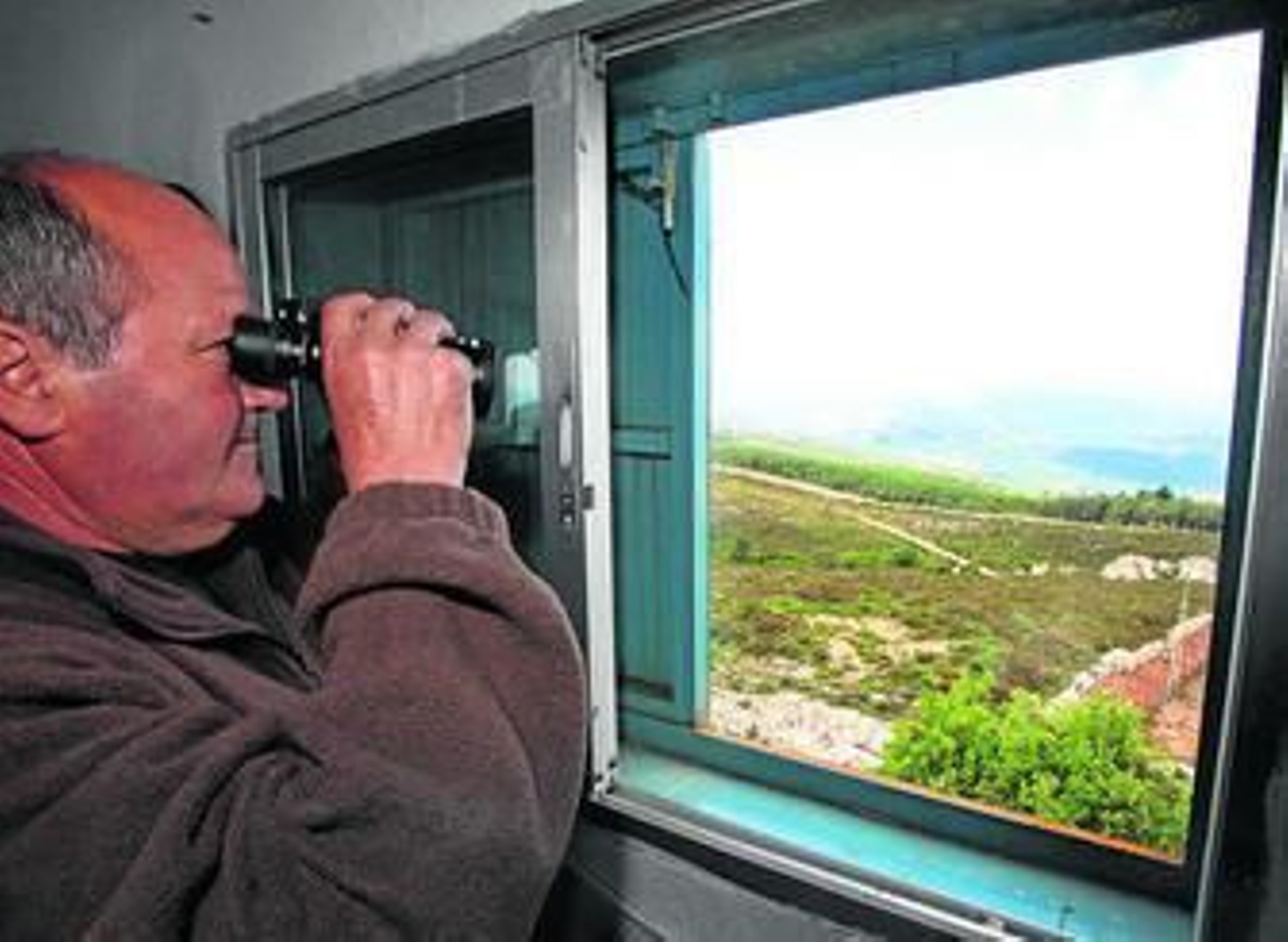 En la finca hay actualmente diez guardas forestales, que tienen su residencia allí y que se encargan de velar por que no haya ningún problema. A estos se le suman desde principios de mes otros dos de la Consejería de Medio Ambiente que también realizan tareas de vigilancia. Una de estas personas es Buenaventura Díaz, 64 años, que de 11 de la mañana a 11 de la noche, desde una torreta en el punto más alto de los Montes, el pico de la Gallina (974 metros), vigila desde su privilegiada posición toda la finca. Buenaventura vive en Algar y se conoce cada metro cuadrado de los montes, ya que se ha criado aquí . Buenaventura se turna con otro compañero para realizar la vigilancia desde la torre, de junio a octubre. Justo en el techo se encuentra el llamado Sistema Bosque, un dispositivo que detecta cualquier fuente de calor que se produzca en los Montes a varios kilómetros a la redonda y que está conectada con el Cedefo de Alcalá. Si localizara algún fuego, saltaría el dispositivo y se pondría en marcha el protocolo que, en primer lugar, evaluaría la importancia del mismo.