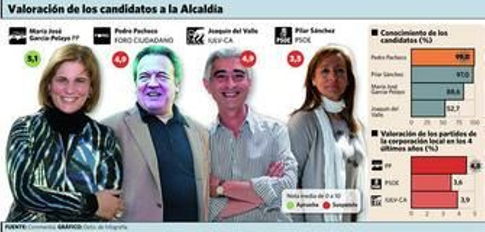 En cuanto al conocimiento de los candidatos, el 99% asegura conocer a Pacheco y un 97% también sabe quién es Pilar Sánchez. A Pelayo la conoce el 88,6% de los sondeados, y a Joaquín del Valle, un 52,7%. Estos son datos de popularidad sugerida que resultan cuando se pregunta al entrevistado si conoce un nombre en concreto, pero cuando la pregunta es en espontáneo (sin citarlos) los índices caen y mucho. Sólo el 58% sabe decir que Pilar Sánchez será la candidata del PSOE; un 48% reconoce a Pelayo como la alcaldable popular; y únicamente un 30,2% indica que Pacheco encabezará la lista del Foro Ciudadano. Con el exalcalde la confusión es manifiesta porque cuando se pregunta a la vez por el candidato andalucista de PSA+PA también sale su nombre en primer lugar.
