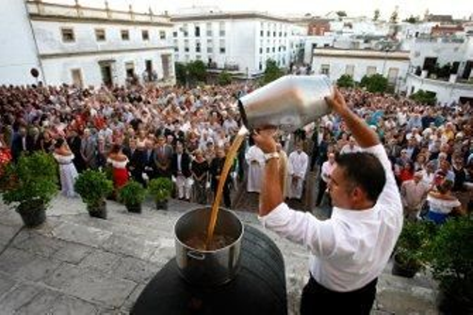El único cambio en el ritual, consagrado con el tiempo, es el cambio de horario, que se trasladó a última hora de la tarde para evitar el rigor del calor característico de esta época del año para propiciar una mayor afluencia de jerezanos y visitantes, los mismos que ayer inmortalizaron con sus cámaras el momento en el que el nuevo vino salía por la piquera del lagar, también saludado por el repique de las campanas del templo catedralicio y los sones del himno de la Vendimia de Moisés Davía, interpretado por la Banda Municipal de Música de la que el autor fue director.