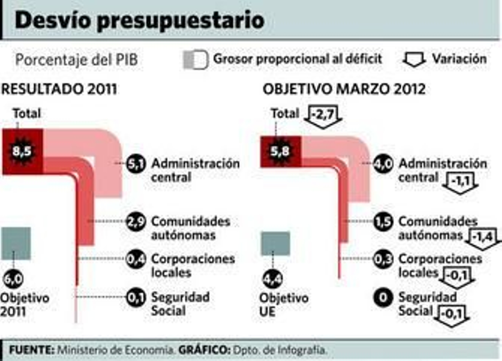El recorte de 44.000 millones de euros necesario para lograr el objetivo de déficit del 4,4% en 2012 era excesivo para el Gobierno. Con el 5,8%, el déficit máximo en el que podrá incurrir la Administración central será del 4%, mientras que las comunidades autónomas no podrán pasar del 1,5%, los ayuntamientos del 0,3% y la Seguridad Social tendrá que cerrar en equilibrio.
