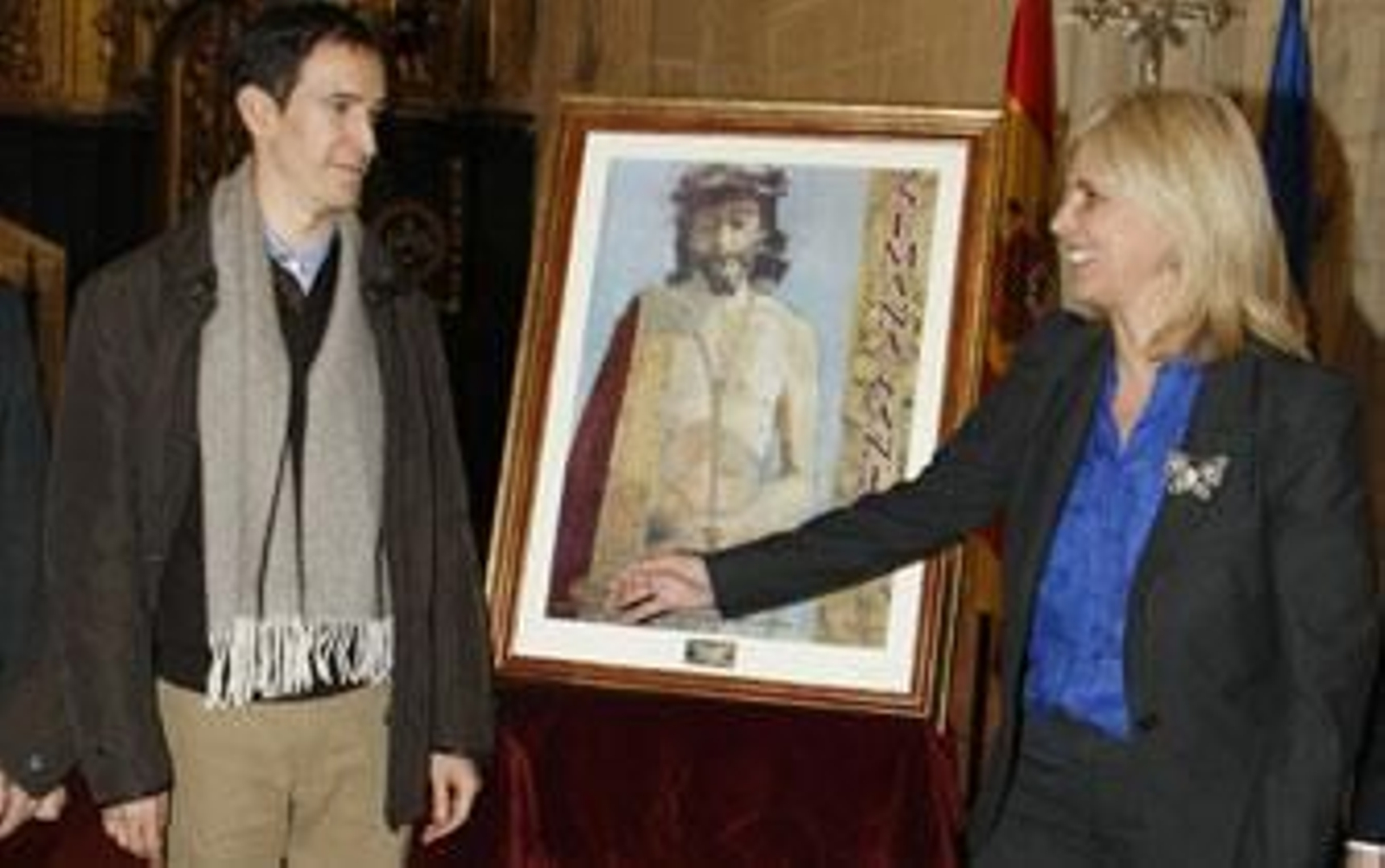 Jesús Jerónimo Jiménez es el autor de la obra ganadora del concurso que convoca la Unión de Hermandades dotado con un premio de 3.000 euros. Es licenciado en Bellas Artes y el jurado destacó de su cuadro la técnica empleada calificándola de muy experta destacando la serenidad del rostro del Señor. El Ecce Homo domina una obra en la que también se apuntan detalles que lo ubican en su entorno como los frisos de la fachada del cabildo de la Asunción. Buena entrada en San Dionisio en cuyo altar mayor se situó el Ecce Homo. El ambiente se llenó de compases de Beigbeder, Orellana y Davia. Actuó como presentador el periodista Gabriel Álvarez que condujo un acto que se abrió con una marcha, glosó el cartel y dio paso al descubrimiento del cartel, que lo hicieron la alcaldesa, el presidente del Consejo, el autor y el hermano mayor del Mayor Dolor. Jesús Jiménez tuvo el detalle de obsequiar como recuerdo algunos bocetos del cartel. La primera intervención estuvo a cargo de Pedro Pérez que resaltó el valor del anuncio oficial de la Semana Santa. Evocó el tiempo que se abre con la presentación de ayer: "Ya huele a Semana Santa", dijo para resaltar el significado que en los sentimientos tiene el acto. Calificó como un privilegio poder "mostrar a Cristo en los escaparates y en cualquier rincón de la ciudad". Hizo un ruego para que "los que ostentamos responsabilidades cofrades seamos siendo capaces de seguir anunciando el Evangelio y trabajando por la sociedad". La alcaldesa cerró la cita con unas palabras en las que se unió a las peticiones del presidente de solidarizarse con los cristianos que sufren persecución por ser católicos. "La Semana Santa es un hecho religioso y una realidad de fe aunque tenga otras consecuencias positivas para la ciudad", manifestó. García-Pelayo aprovechó para reiterar el compromiso del Ayuntamiento con el movimiento cofrade: "Han sido años difíciles para todos pero se va avanzando" y adelantó que en el próximo pleno irá a aprobación la cesión del edificio del Mamelón como sede del organismo cofrade.
