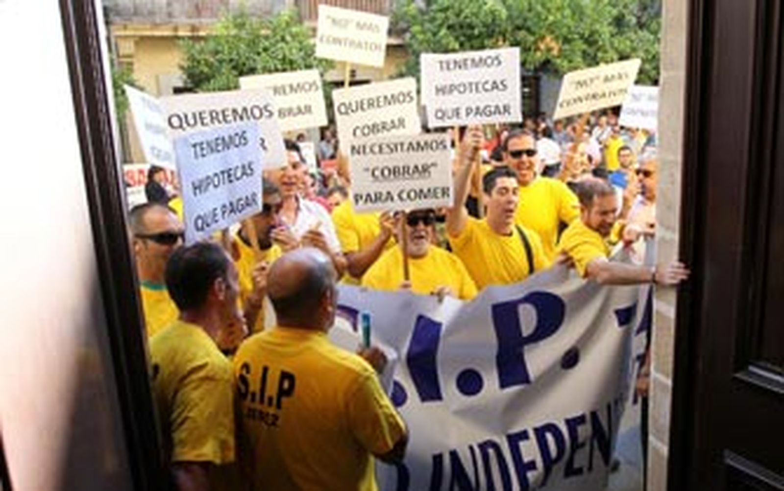 El cargado ambiente laboral de Jerez se crispó ayer definitivamente cuando un numeroso grupo de trabajadores de Urbanos Amarillos irrumpió en el Consistorio sobre las diez y media de la mañana en el Consistorio para reclamar el dinero pendiente. Allí se sentaron. En las puertas protestaban a la vez numerosos policías locales fuera de servicio (convocados por el SIP) que emplearon una bocina neumática para hacerse oír y reclamar la nómina de septiembre. Los agentes iban ataviados con camisetas amarillas e hicieron uso de silbatos a diestro y siniestro durante la concentración.