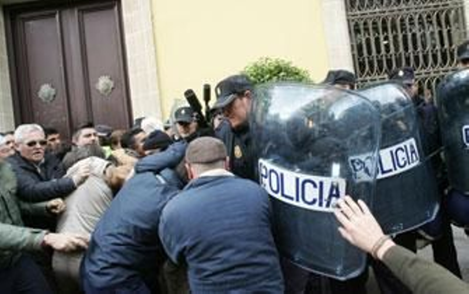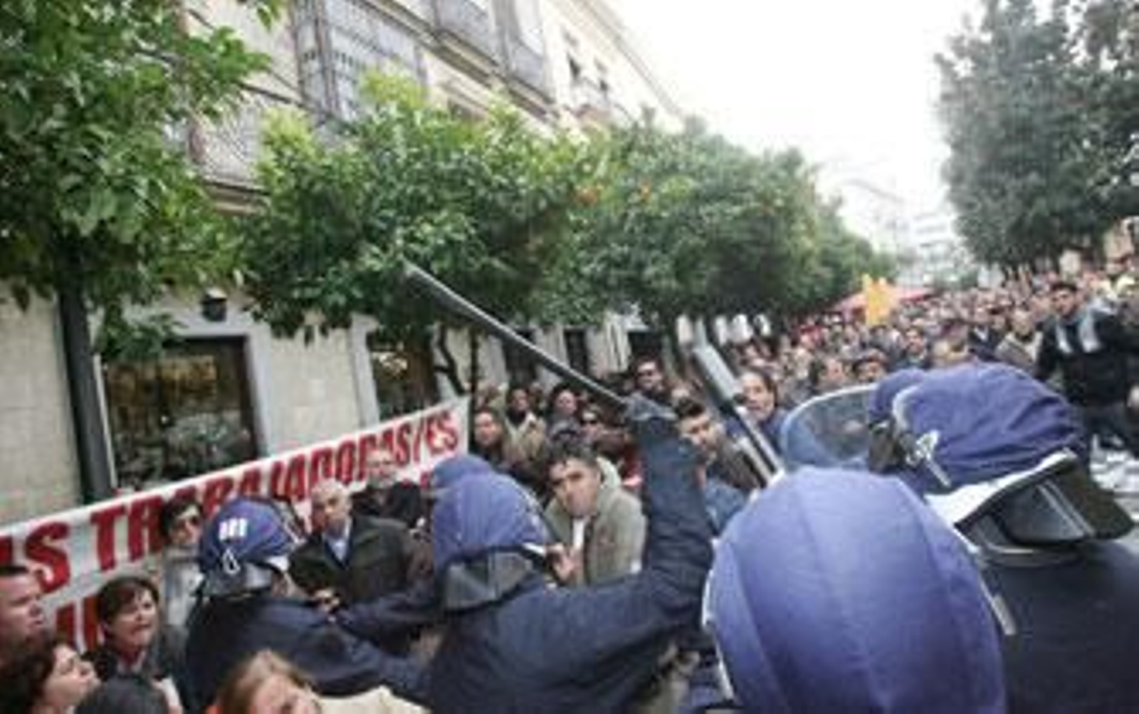 Bocinas, sirenas y petardos dejaron sordo el salón de plenos, lo que forzó a los grupos de la Corporación municipal a congelar durante más de media hora una sesión con escasísimos temas de enjundia en su orden del día que, en cambio, se vio posteriormente salpicada por unos sucesos vergonzosos. La crispación y la bronca subió varios grados de temperatura en el exterior, con un muro de contención de agentes de la Policía Local y Nacional que a duras penas resistían los envites de los manifestantes, empeñados en colarse en el Ayuntamiento. En el momento en que éstos se aventuraron con mayor insistencia a acceder al interior del Cabildo jerezano, fueron un nutrido grupo de antidisturbios quienes frenaron el empuje con porras y disparos de fogueo. Forcejeos, muchos golpes, empujones, asfixia y momentos de angustia que se saldaron sin heridos de gravedad, aunque con muchas magulladuras y moratones entre los trabajadores. Algún agente de la Policía Local también resultó agredido: "Nosotros también estamos sin cobrar, y me han doblado la muñeca y me han partido las gafas de sol; han sido cuatro tontos tirando naranjas...", relató a este medio un agente del 092. Otros de los presentes recriminaron la actitud del Sindicato Independiente de la Policía Local (SIP), "quienes han esperado a que los antidisturbios cargaran para quitarse de en medio, irse a la plaza del Arenal y quitarse las camisetas de protesta". "Ante estos hechos violentos, toda la representación del SIP se retiró del lugar, no participando de ninguna forma en los mismos", aseguraron desde el sindicato local en un comunicado de prensa remitido posteriormente.