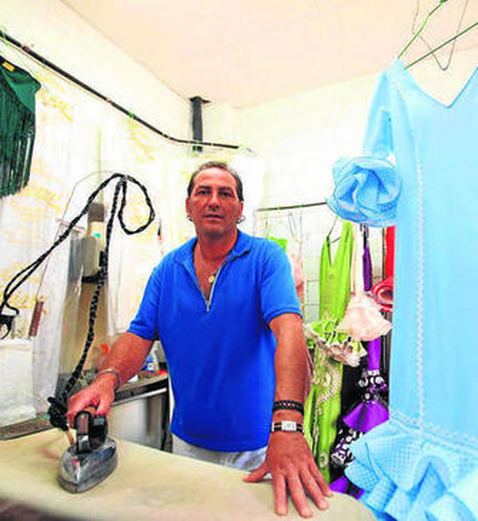 José María Gutiérrez no recuerda el día en el que empezó a trabajar entre volantes y túnicas. Era bien pequeño cuando comenzó a interesarse en el negocio familiar y decidió entonces ayudar a su padre en la labor del planchado, los tintes y la limpieza de ropa. La tintorería Pina, reconocida como la más antigua de España y de origen galo, es un negocio familiar que lleva más de 75 años en la calle Medina, número 8. Su padre la heredó y desde hace años, José María es el único responsable. Aprendió este oficio desde bien pequeño y siempre recuerda los veranos como la época en la que tienen que buscar todo tipo de trucos para evitar las altas temperaturas. "El mejor remedio es tener agua fría cerca y comenzar la jornada desde bien temprano, para así acabar cuando sean las horas más duras", explica. Pero a pesar de estos hábitos, todos los años, por estas fechas se dan olas de calor que hace que sea la peor temporada para trabajar.