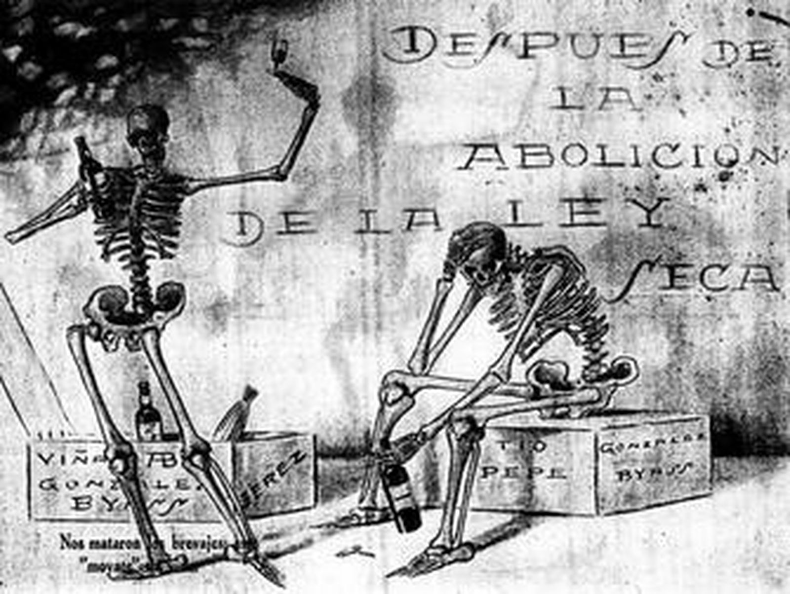 Saber beber es una ciencia que muchos ignoraban y que algunos ya han aprendido; evitándose las diarias borracheras que a muchos hacía dormir la mona, en plena calleLos niños se aficionaban a la lectura de los libros, leyendo tebeos de aventuras que despertaban su imaginación, y luego cambiaban por otros en el mercadillo dominical del VillamartaDespués de la supresión de la Ley Seca, de los EE. UU. el año 1934, así vio a dos "curdelas", la aguda pluma del pintor jerezano Carlos González Ragel, creador de la "esqueletomaquia". (ARCHIVO DEL AUTOR)
