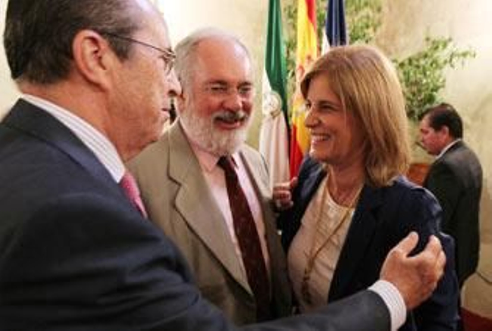 Mientras, en el interior del salón de plenos del Cabildo Antiguo, los presentes escuchaban a la secretaria del Ayuntamiento pronunciar las primera palabras con las que se abría la toma de posesión. Abanico en mano, muchos de los presentes intentaban refrescarse ante el aumento de la temperatura que ya se dejaba notar. Acompañando a los nuevos concejales, se pudieron ver muchas caras conocidas tanto de los partidos que formarán parte de esta nueva Corporación como de representantes sindicales y de distintos colectivos de la ciudad. Por parte del PP, el secretario general andaluz, Antonio Sanz, el exministro Miguel Arias Cañete y el diputado nacional Aurelio Romero esperaban impacientes que García-Pelayo tomase el bastón de mando. Sanz, eso sí, abandonó el acto antes de finalizar debido a que tenía que desplazarse a la toma de posesión de José Loaiza en San Fernando. También representantes del PSOE como la diputada Mamen Sánchez, la delegada provincial de Educación, Blanca Alcántara, y el exconsejero y actual presidente del Consejo Regulador del Vino, Antonio Fernández, presenciaron el acto. El presidente de Solidaridad, Sebastián Peña, los responsables de las asociaciones comerciales Acoje (Fernando García) y de Asunico (Manuel García) participaron igualmente en la toma de posesión junto a los representantes sindicales José Manuel Trillo (CCOO), Pedro Alemán (UGT) y José García (CGT), entre otros. Miembros de asociaciones agrícolas, del vino y cofrades, pudieron verse ayer también en el Cabildo.