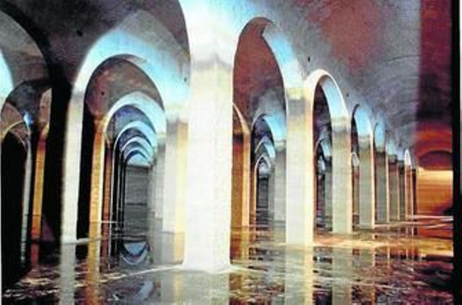 En la primera planta, atravesando la entrada, la construcción de ladrillo deja paso un depósito dividido en dos por un largo pasillo que conecta las dos puertas del edificio. La imagen del tanque lleno completamente solo deja ver el final de sus columnas, que se conectan entre sí formando una estructura de arcos que bien pueden recordar a alguna mezquita mozárabe, como la de Córdoba. Lo que no se ve, la profundidad del recinto hacia abajo supera los cuatro metros y medio de profundidad. El agua llega directamente al depósito por las conducciones a través de cuatro 'llenadoras' -como las llaman sus técnicos-, creando unas pequeñas cascadas en su llegada al recinto. Tras medir el nivel de cloro, en esta sala se le aplicará la cantidad de hipoclorito sódico necesario. Una vez realizado el tratamiento, el líquido pasa por las inmensas tuberías de la sala de llaves para dirigirse a los domicilios de la zona centro de Jerez.