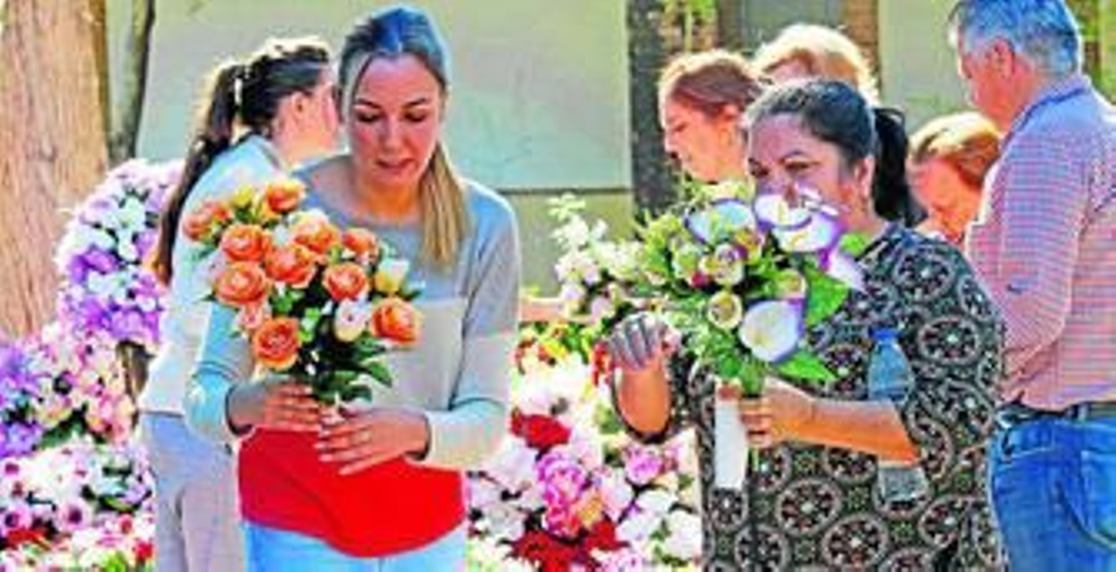 Cubos, fregonas, estropajos y mucha flores. Los familiares de los fallecidos entraban y salían sin hacer mucho 'ruido'. El silencio y la solemnidad reinó entre los patios, mucho andar con la cabeza baja y las manos entrelazadas. Aunque para la mayoría no es la única visita en el año, en estos días no se puede faltar a Todos los Santos, así sea para limpiar sólo el polvo del mármol o para cambiar ese ramo de margaritas blancas que se dejó semanas atrás. Los contenedores colocados en los laterales de los bloques se fueron llenando de flores viejas, esas que han perdido el color por un sol de justicia que ayer provocó que más de uno se tuviera que mojar la nuca para refrescarse.