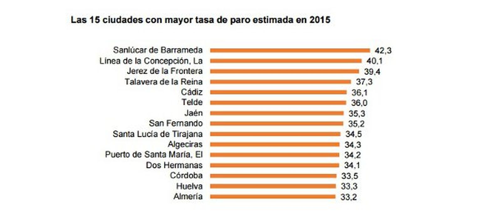 De esta manera, resulta que de las 111 ciudades españolas, las que presentan mayor tasa de desempleo son, por este orden, Sanlúcar, La Línea, Jerez, Cádiz (quinto puesto), San Fernando (octava), Algeciras (décima) y El Puerto (undécima).