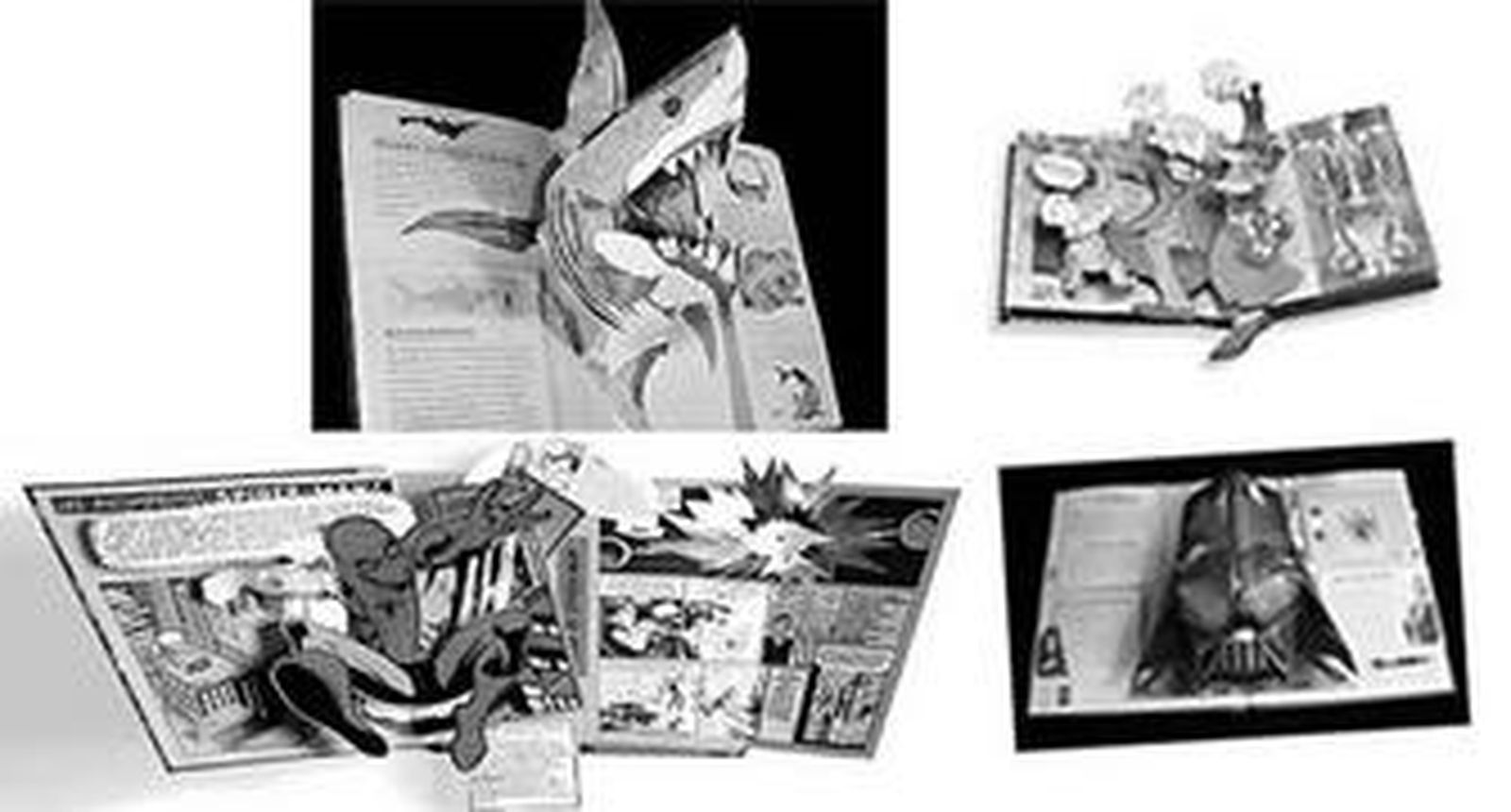 El término pop-up se suele aplicar a cualquier libro tridimensional o móvil, con transformaciones, libros de (efecto de) túnel, de piezas giratorias, solapas que se levantan (flaps), pestañas que se jalan (pull-tabs), imágenes emergentes (pop-outs), mecanismos de tiras que se jalan (pull-downs) y más, cada uno de los cuales funciona de una manera diferente. Un blog muy interesante en el que aprender alguno de los trucos sobre cómo producir estos efectos es http://librospopup.b logspot.com/, del que podemos imprimir algunos ejemplos para montarlos.