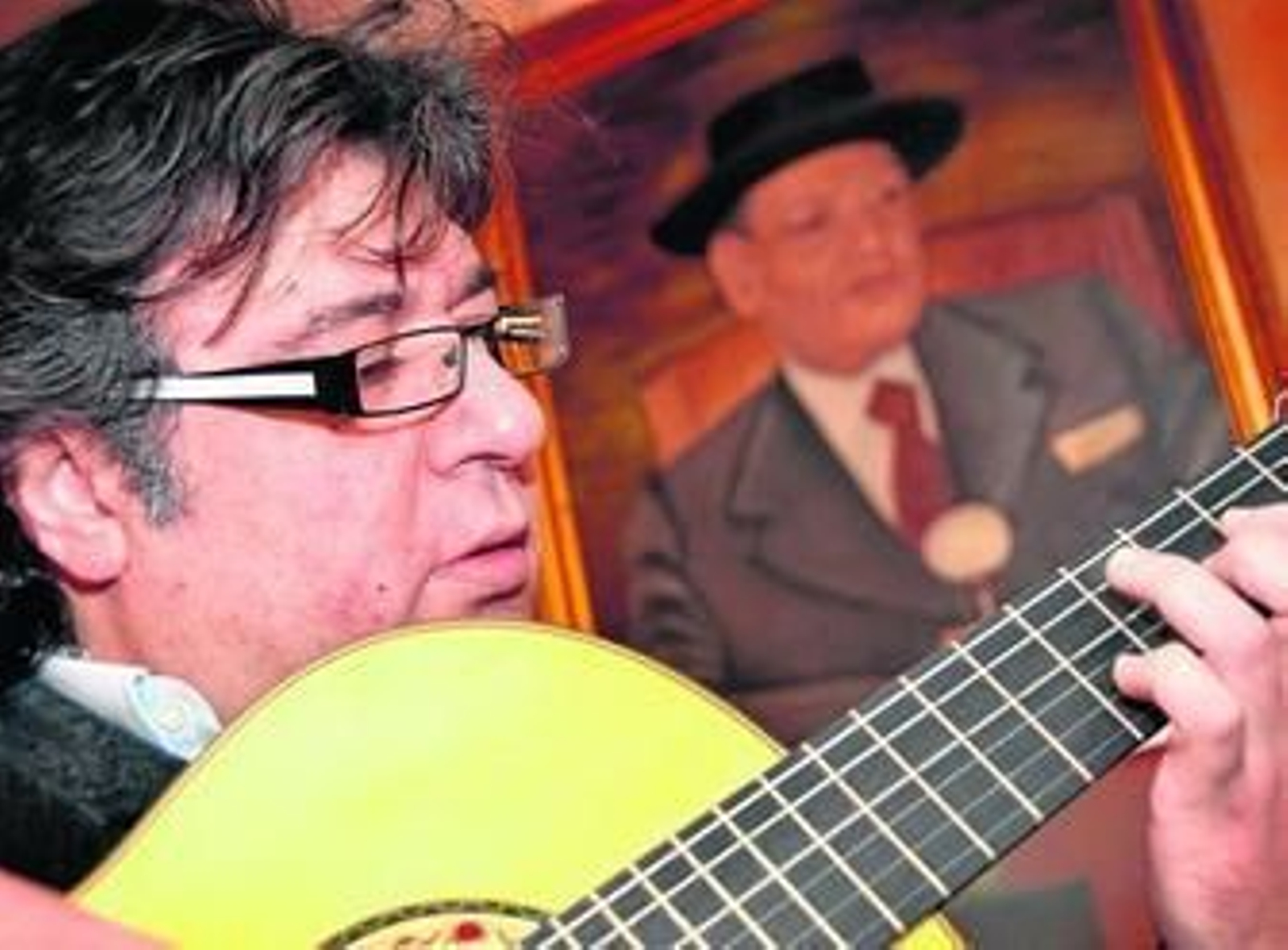 Manuel Parrilla toca la guitarra con el cuadro de su abuelo Tío Parrilla, de fondo.