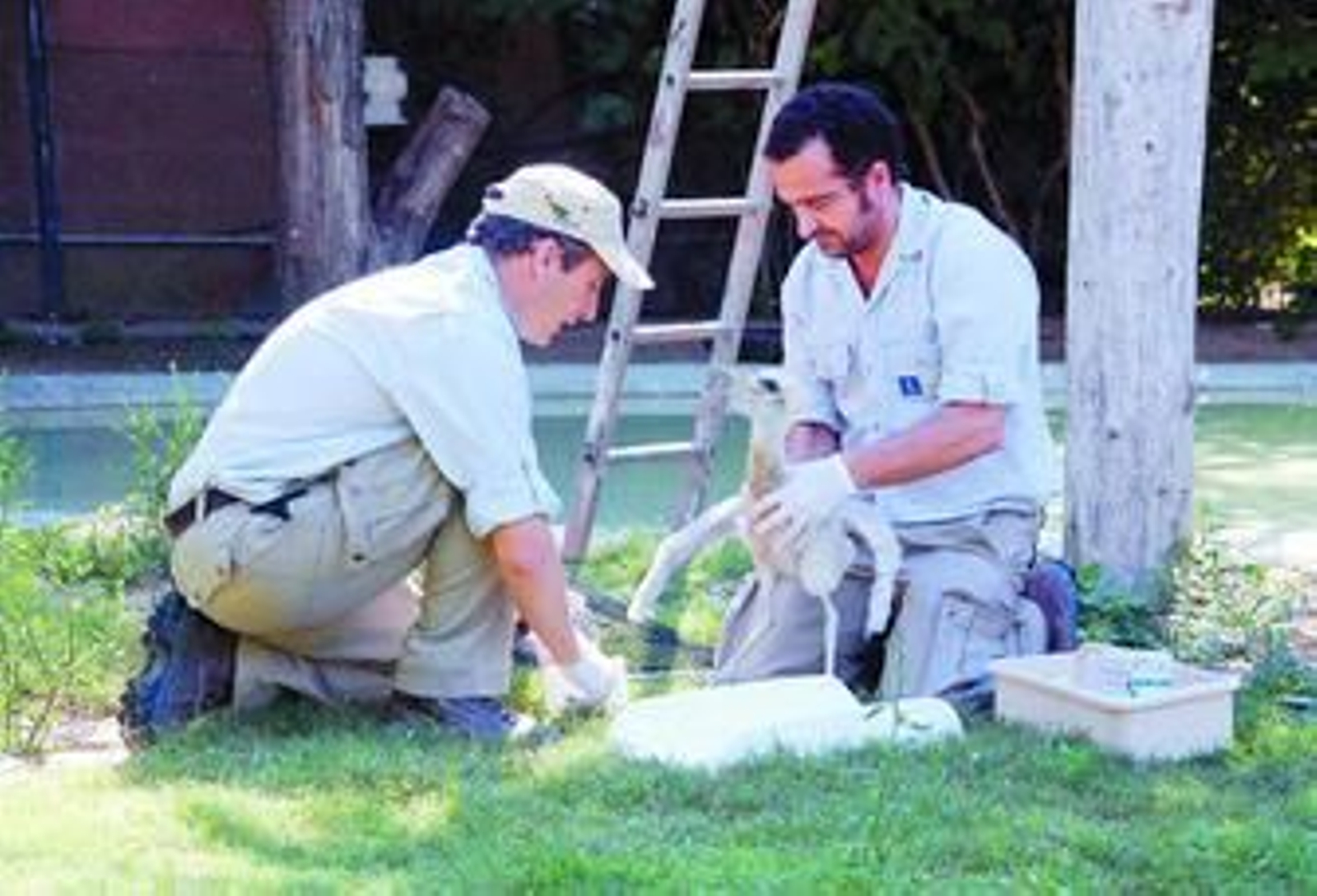 "Hay que colocar las anillas en un momento justo para que le puedan entrar y no puedan quitárselas", según explicó el biólogo del Zoobotánico, Íñigo Sánchez, tras salir de la jaula donde anilló a los dos pollos nuevos.