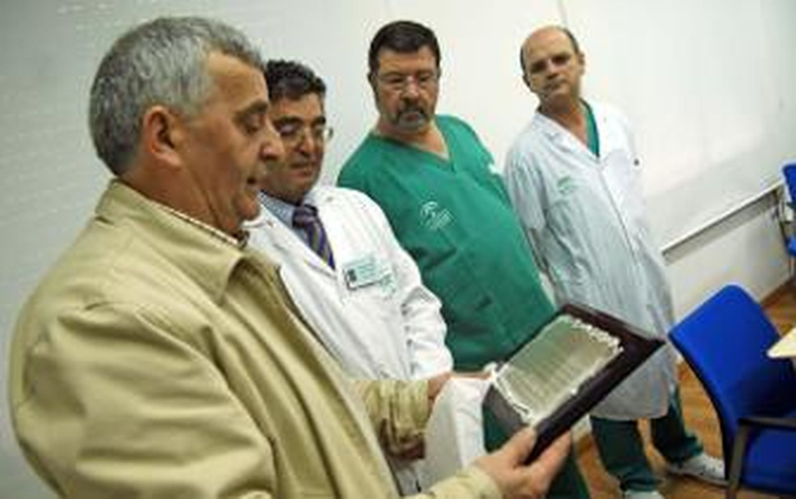 Por eso antes de entregar la placa se dirigió a parte del equipo de profesionales que intervinieron en su operación, entre ellos, el anestesista Fernando Rodríguez Huertas, para decir que "con mi corazón agradezco lo que el hospital de Jerez ha hecho por mi persona. Recorrí muchos hospitales públicos y privados y tan sólo el equipo del doctor Mateo me dio la solución". Mariano aprovechó también para pedir más medios para los hospitales públicos y confió en que otros pacientes con su patología puedan beneficiarse de la técnica que emplearon en su intervención. "Fíjense, yo pensaba en jubilarme y ahora estoy trabajando con más brío". Además entregó una placa de reconocimiento al oftalmólogo Enrique Molina Jurado, del que alabó su dedicación a muchos jerezanos y sanluqueños, "aún a costa de su tiempo de ocio".