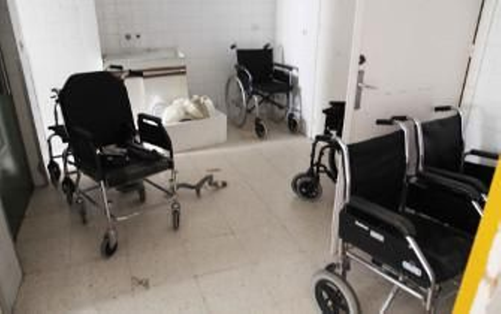 Las neveras frigoríficas ya no tienen puertas, se lo han llevado todo, y en la pared sigue pegado un folio con los pedidos de cocina. Los techos están rajados, estratégicamente, para llevarse la instalación eléctrica y los aires acondicionados y hasta al más valiente le puede dar grima la sala de los empleados, con una rebeca azul colgada de una percha y zapatos de 'enfermero' tirados por los suelos. El asilo es un auténtico laberinto con marcos de puertas pintados de azul, amarillo y rojo, persianas rotas y baños sin grifería.