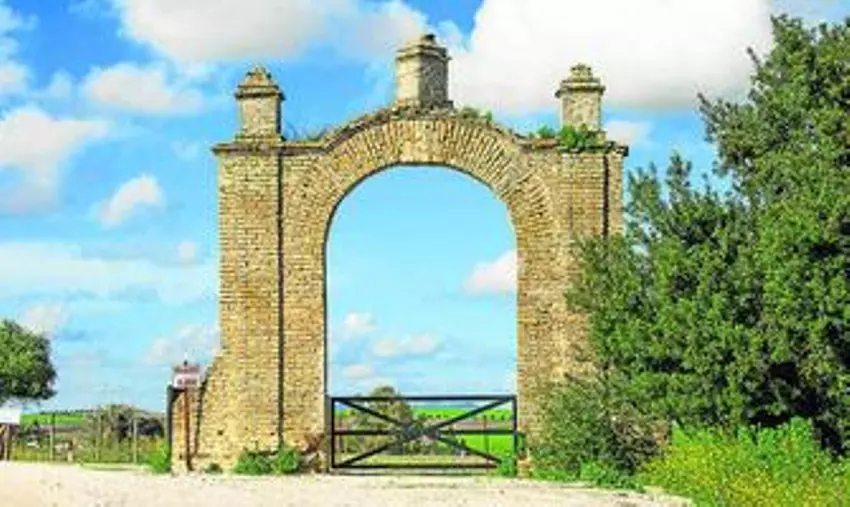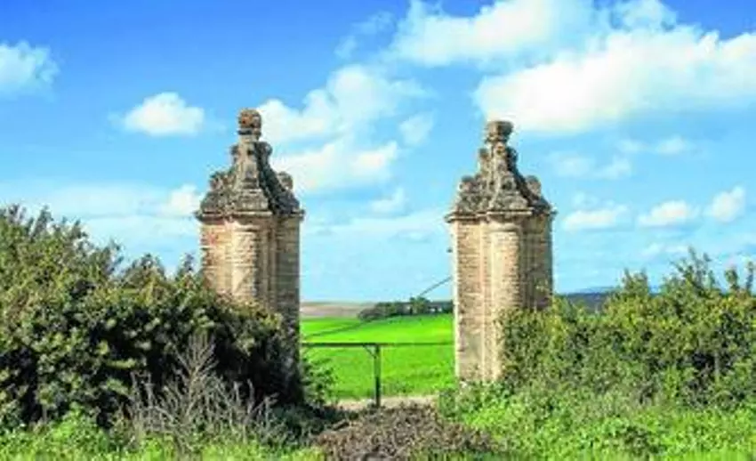 Siguiendo nuestro paseo por la cañada, iniciamos ahora un ligero descenso y la vista se nos abre hacia las tierras de La Guareña. Cuando llevamos recorridos algo más de 1 km, tomaremos un pequeño desvío hacia la izquierda en dirección al Cortijo de Alcántara, que visitaremos en otra ocasión. En este punto descubriremos la segunda de las antiguas puertas de acceso al Olivar de Panés. Construida también en ladrillo, presenta forma de arco, rematándose sus pilares con sendos pedestales que debieron estar coronados en su día tal vez por bolas, cruces u otro tipo de ornamentos. Coronando el arco, sobre el trasdós, un tercer pedestal sobresale de los laterales, dotando al conjunto de una sobria elegancia que parece indicar que, tal vez esta, era la entrada principal de la finca.