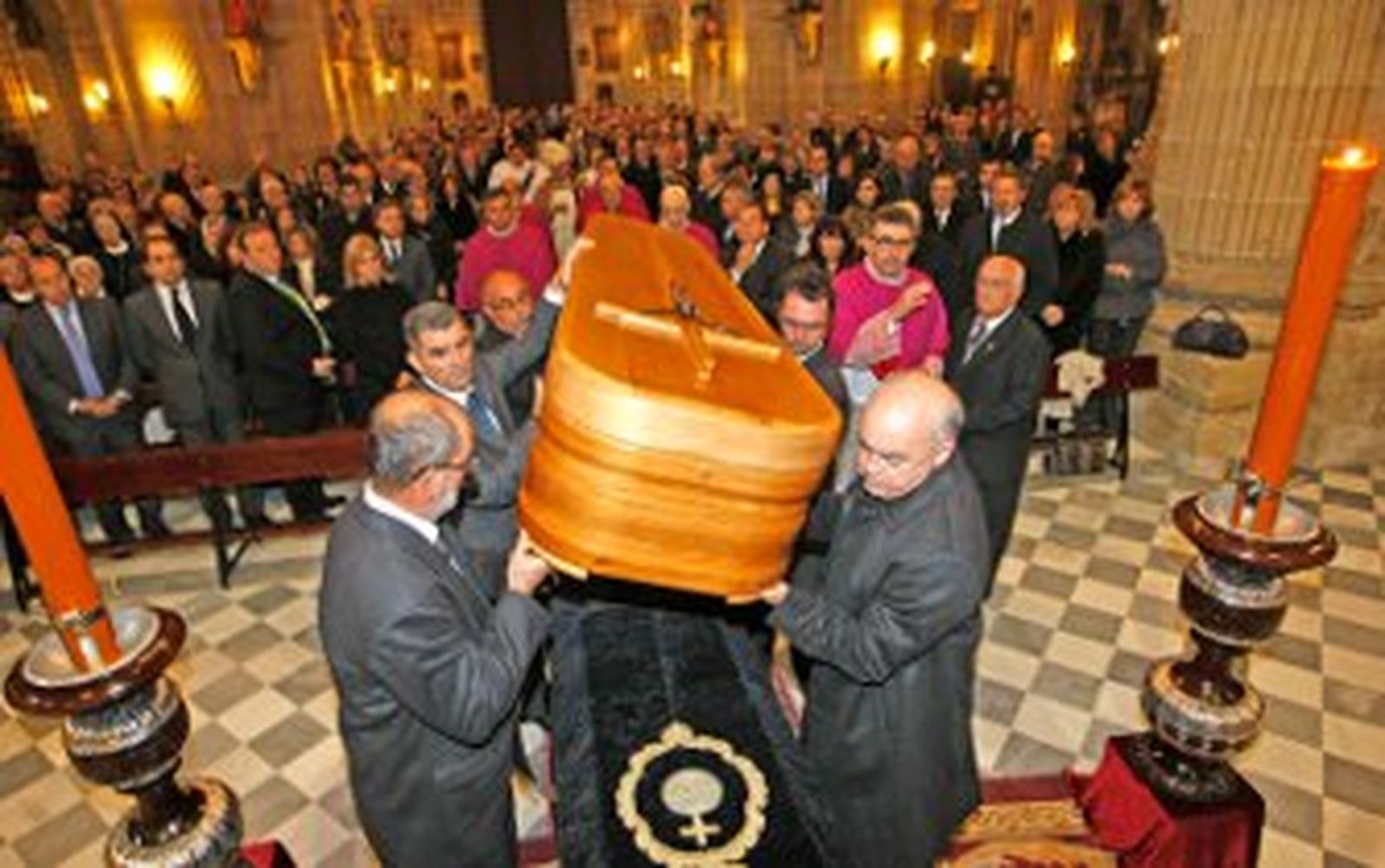 Se dispuso un cortejo integrado por sacerdotes diocesanos, portando el ataúd cofrades de la hermandad de La Resurrección que lo llevaron hasta un túmulo instalado la pie del presbiterio que se dispuso flanqueado con los hachones del paso del Cristo de la Viga y cubriéndolo un paño funerario de la Catedral, todo acompañado por la sublime música del Funeral de la Reina Mary de Inglaterra, de Purcell, interpretado por un grupo de viento y un tambor destemplado. Abriendo la comitiva estuvieron 17 sacerdotes, todos precediendo al féretro y cerrando el obispo junto a ocho canónigos.