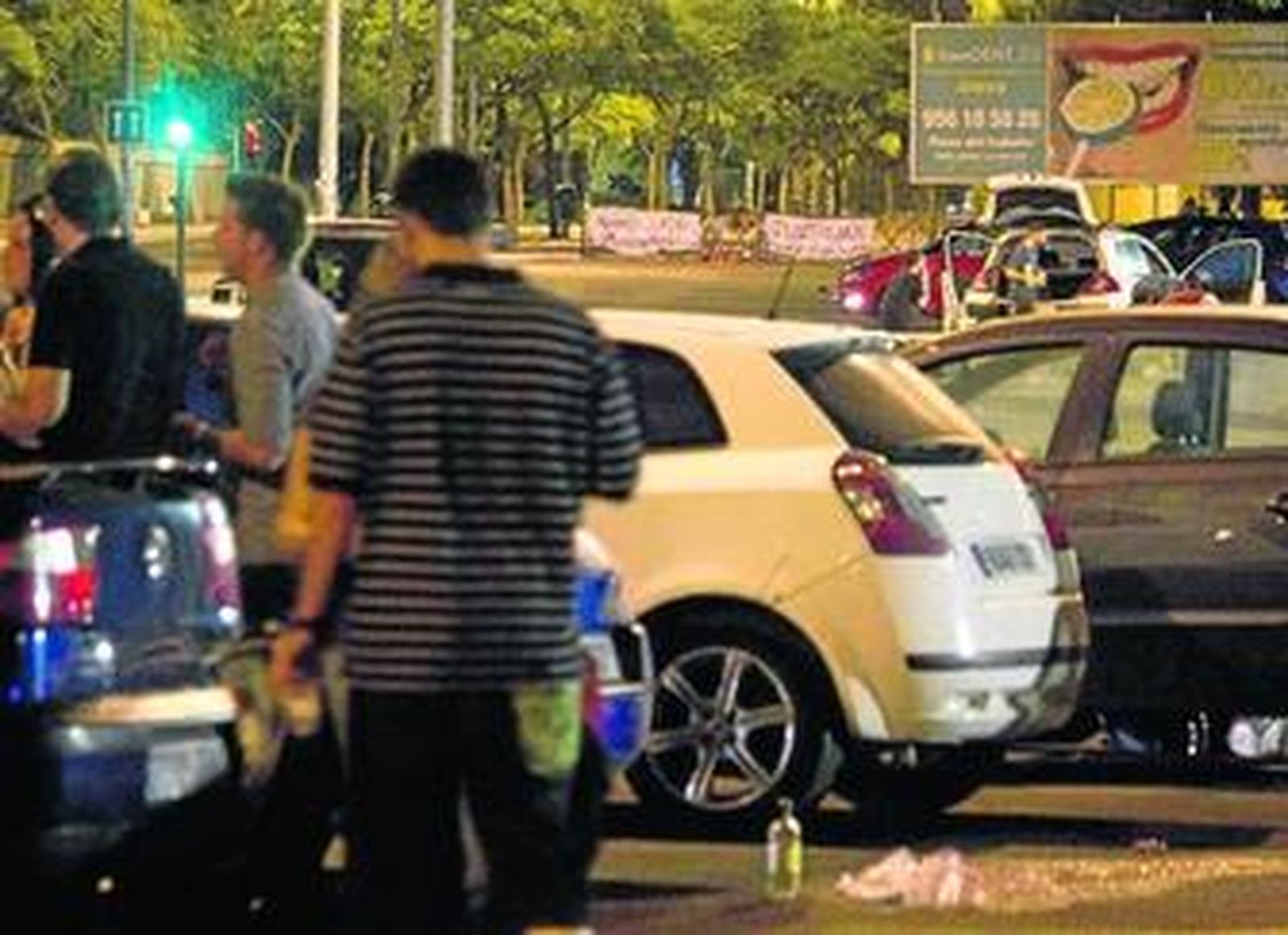 La música electrónica procedente de los automóviles fue la banda sonora de la noche y en el centro del 'botellódromo', donde la luz de una de las pocas farolas alumbraba mejor, se situaba una pequeña congregación de automóviles compuesta por una veintena de coches. En ella, pequeños grupos de personas que hacían 'botellón' se escondían entre las puertas de los vehículos.