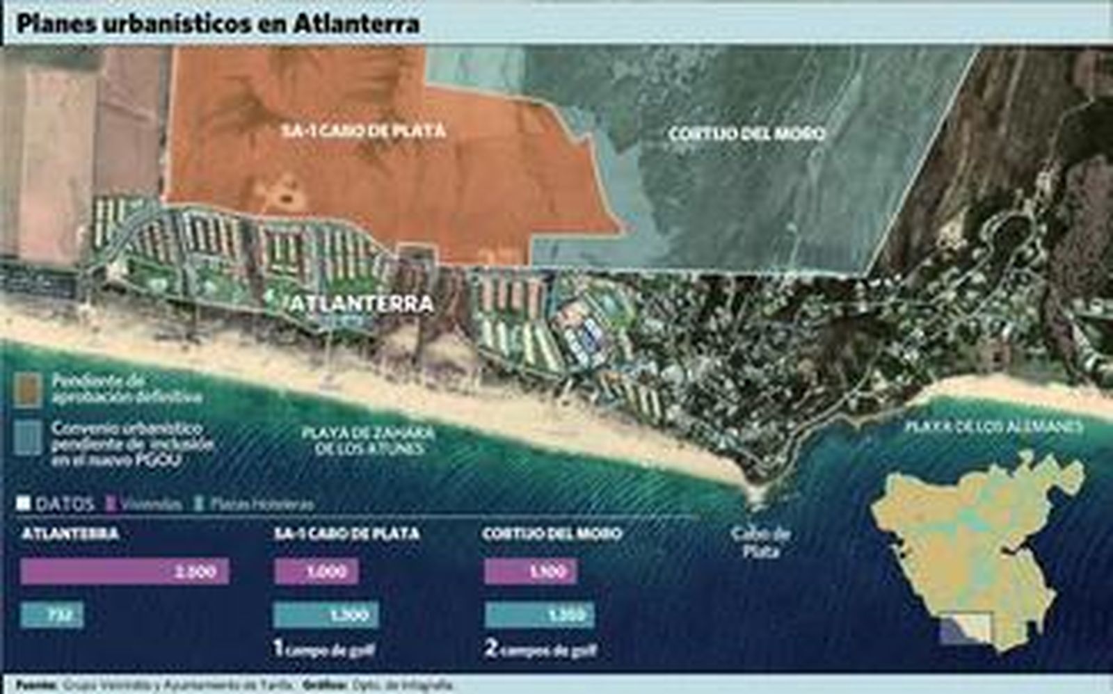 El equipo de Gobierno de Tarifa (PSOE en coalición con IU) da por hecho que la Administración andaluza aceptará el plan parcial SA-1 Cabo de Plata, que dibuja un campo de golf, un millar de viviendas y unas 1.300 plazas hoteleras, en la segunda línea de Atlanterra. Grupo Q insistió en la baja densidad de sus edificaciones, pero su propuesta fue paralizada en 2007 por la Comisión Provincial de Urbanismo: las zonas residenciales se extendían demasiado sobre la parcela y quedaban aisladas -lo que encarece la inversión en equipamientos-, y el suministro de agua no estaba garantizado, objetó la Comisión.