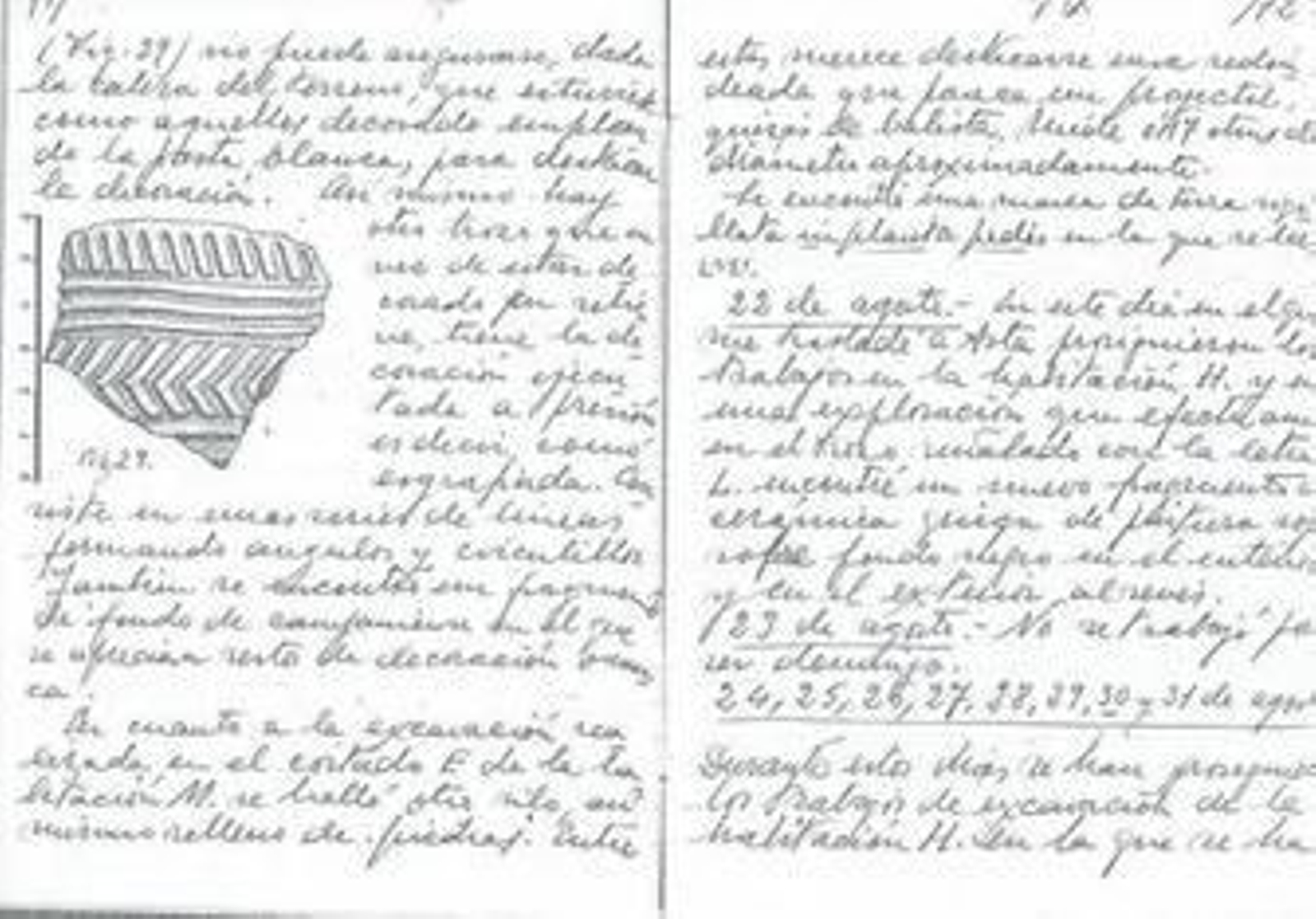 "Ya tengo reconstruidas las vasijas halladas al borde del silo descubierto en la habitación o espacio M. La mayor de ellas, es de la misma forma que la urna encontrada en el espacio L; presentando igual decoración. Como he dicho en las notas referentes al hallazgo dentro de la mayor encontré otra vasija más pequeña, de barro más fino, pero sin presentar como aquella decoración alguna… También se ha hallado en esta zona que se excava unos trozos de asas, llámole de volutas, igual a otras asitas halladas en la cañada de El Catalán".