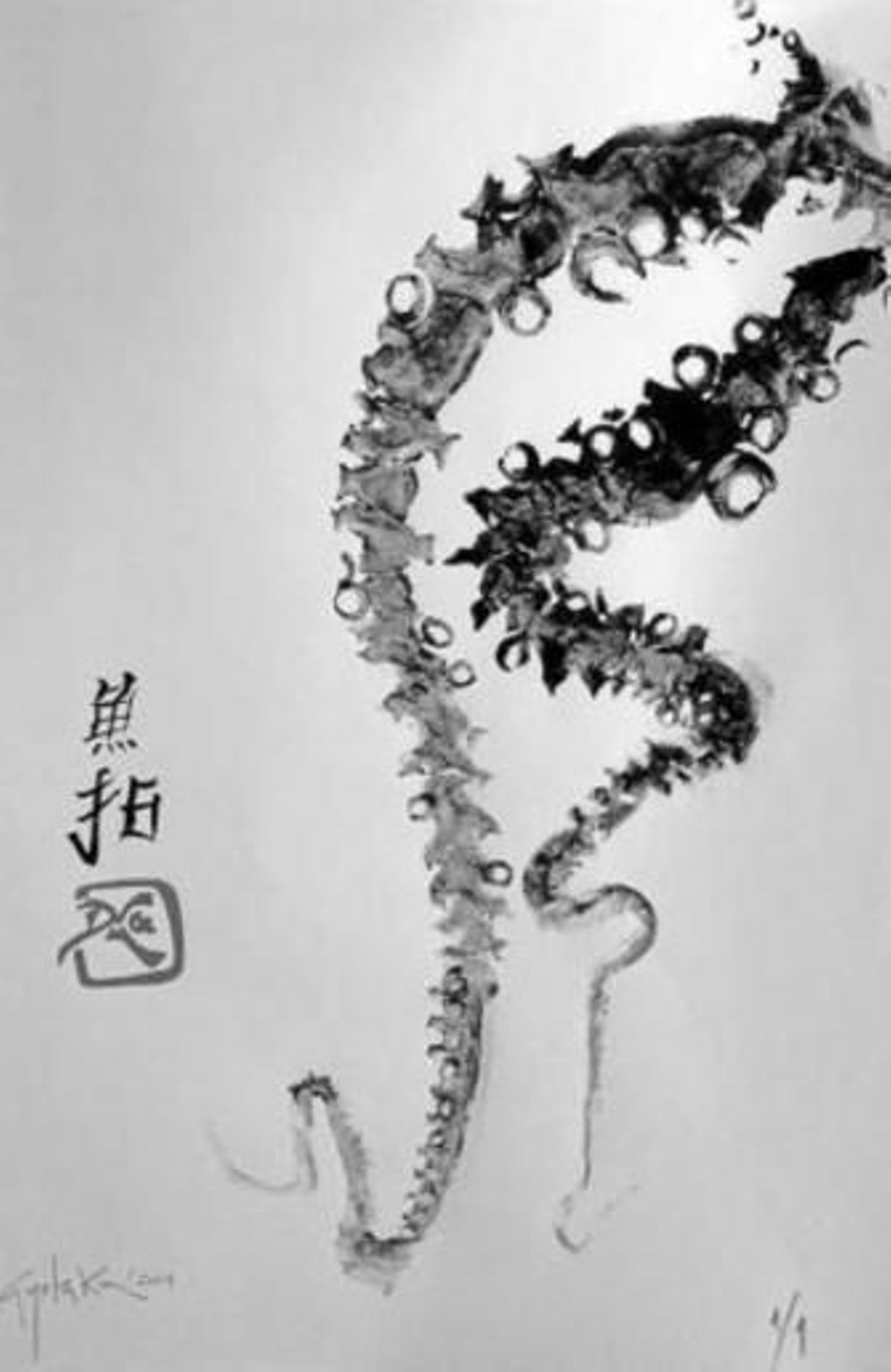 Pareja en la vida artística y familiar, Gabriela Diosdado y Domingo Martínez aseguran disfrutar "mucho" con la vertiente lúdica y pedagógica de los proyectos que emprenden con la técnica del gyotaku, que han llevado recientemente al Festival Internacional de Grabado de Bilbao. "Queremos ampliar nuestra actividad con un taller en el que se cocinen las piezas que se estampan, pues una particularidad de este procedimiento es que los peces pueden consumirse tras dejar su huella en el papel, con lo que se puede disfrutar del pescado 'con los placeres del alma, del orgullo…y también del paladar', según dice una máxima japonesa que suscribimos completamente".