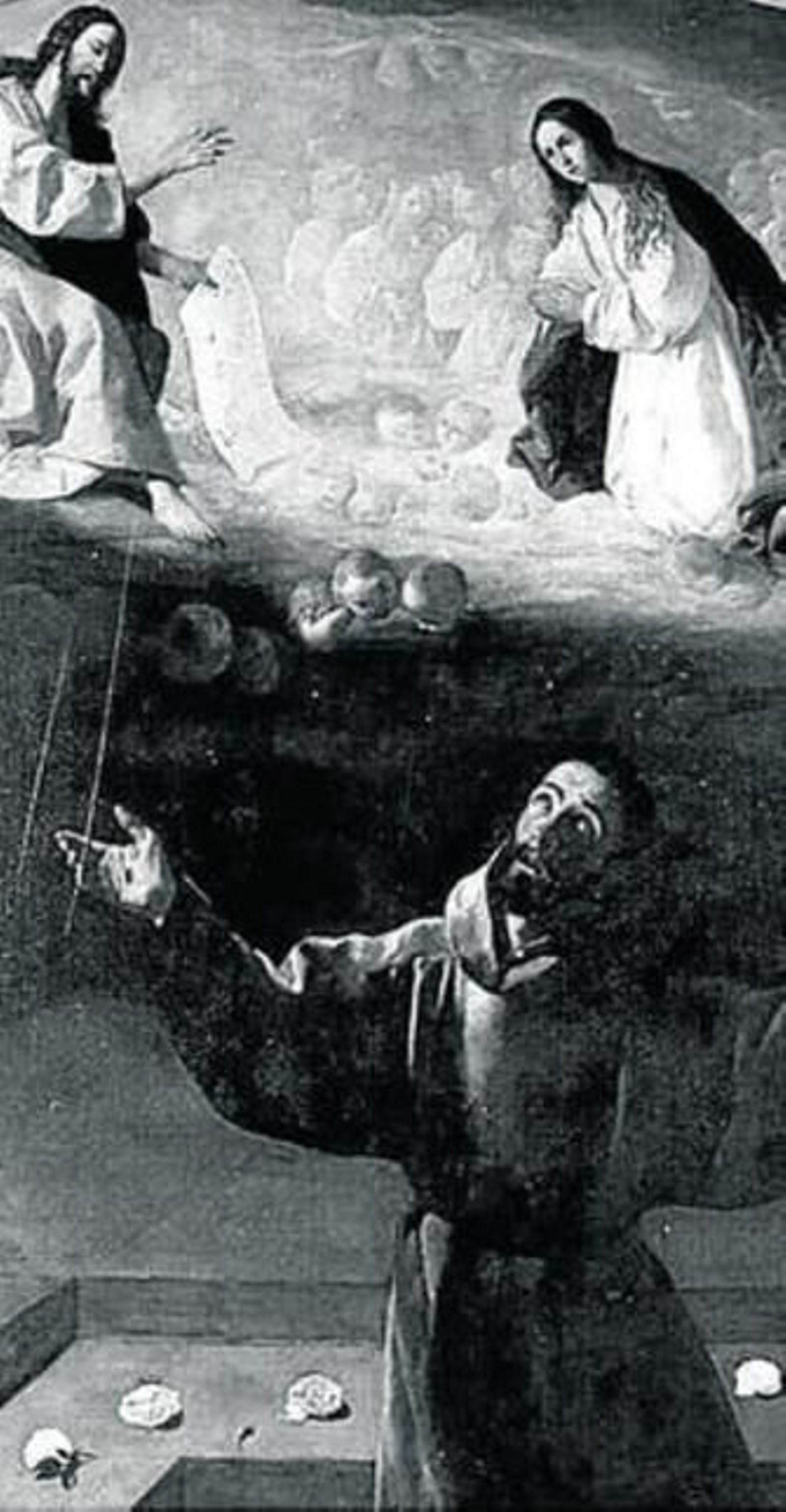La pintura, datada entre los años 1630 y 1640, procede del convento de los capuchinos de Jerez y forma parte de la colección estable del Museo de Cádiz desde principios del XIX. Representa la visión de San Francisco de Asís en la capilla de la Porciúncula, la aparición de la Virgen y Cristo en la que San Francisco recibe las normas que le servirían para redactar la segunda Regla de la orden franciscana.